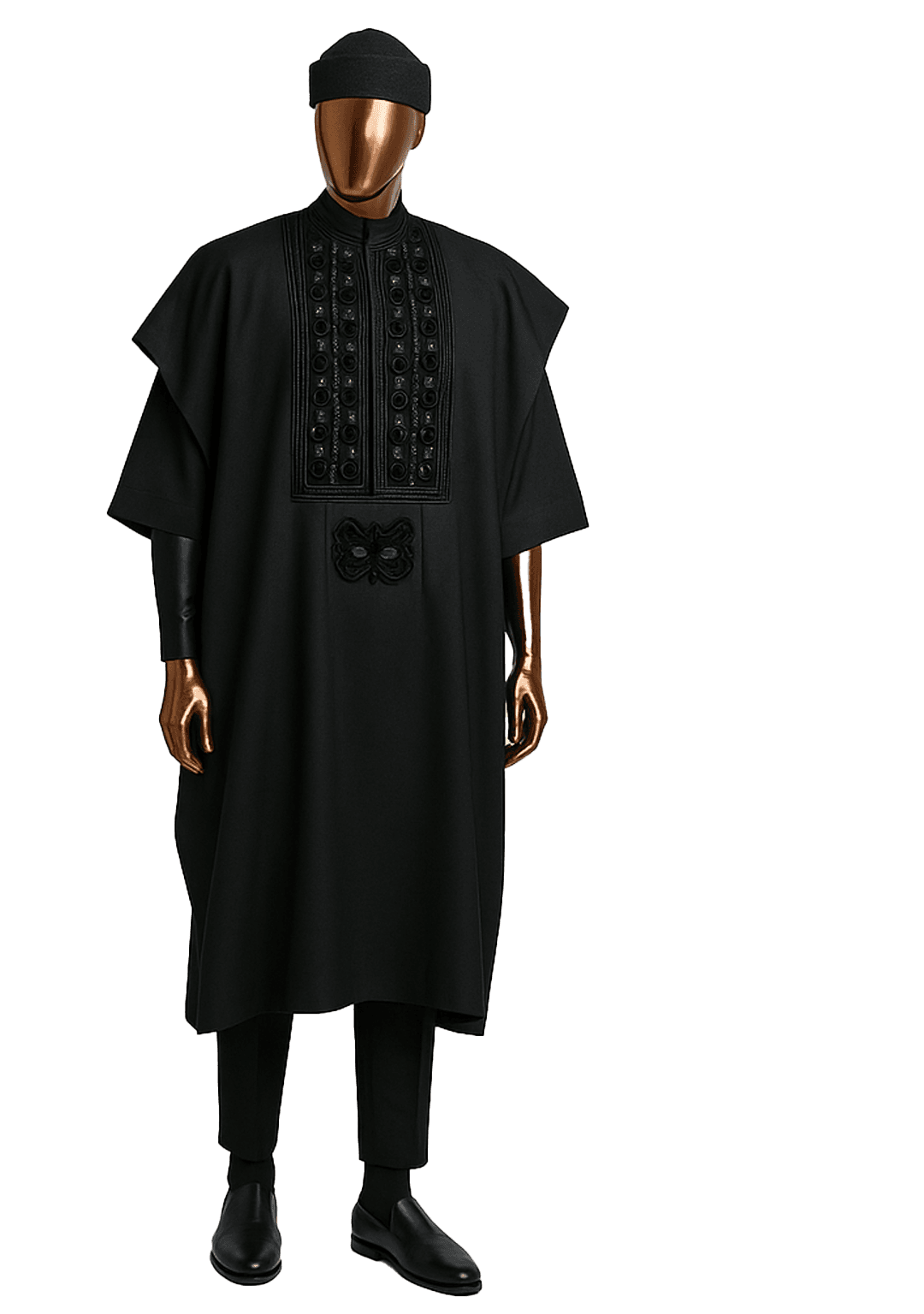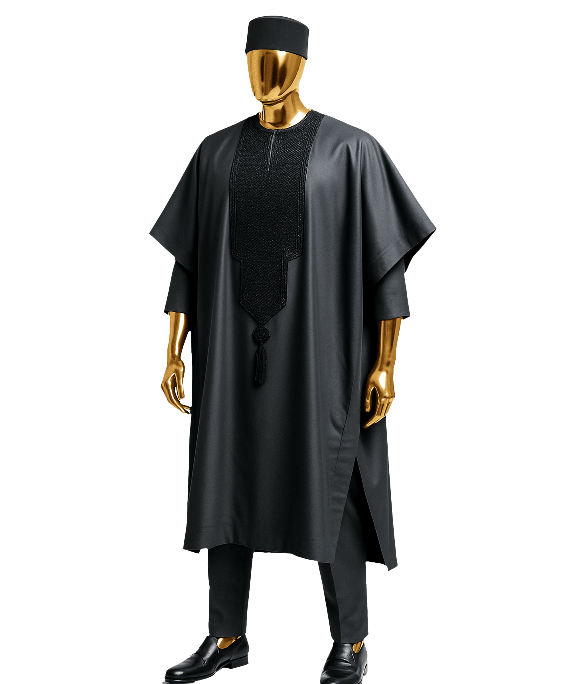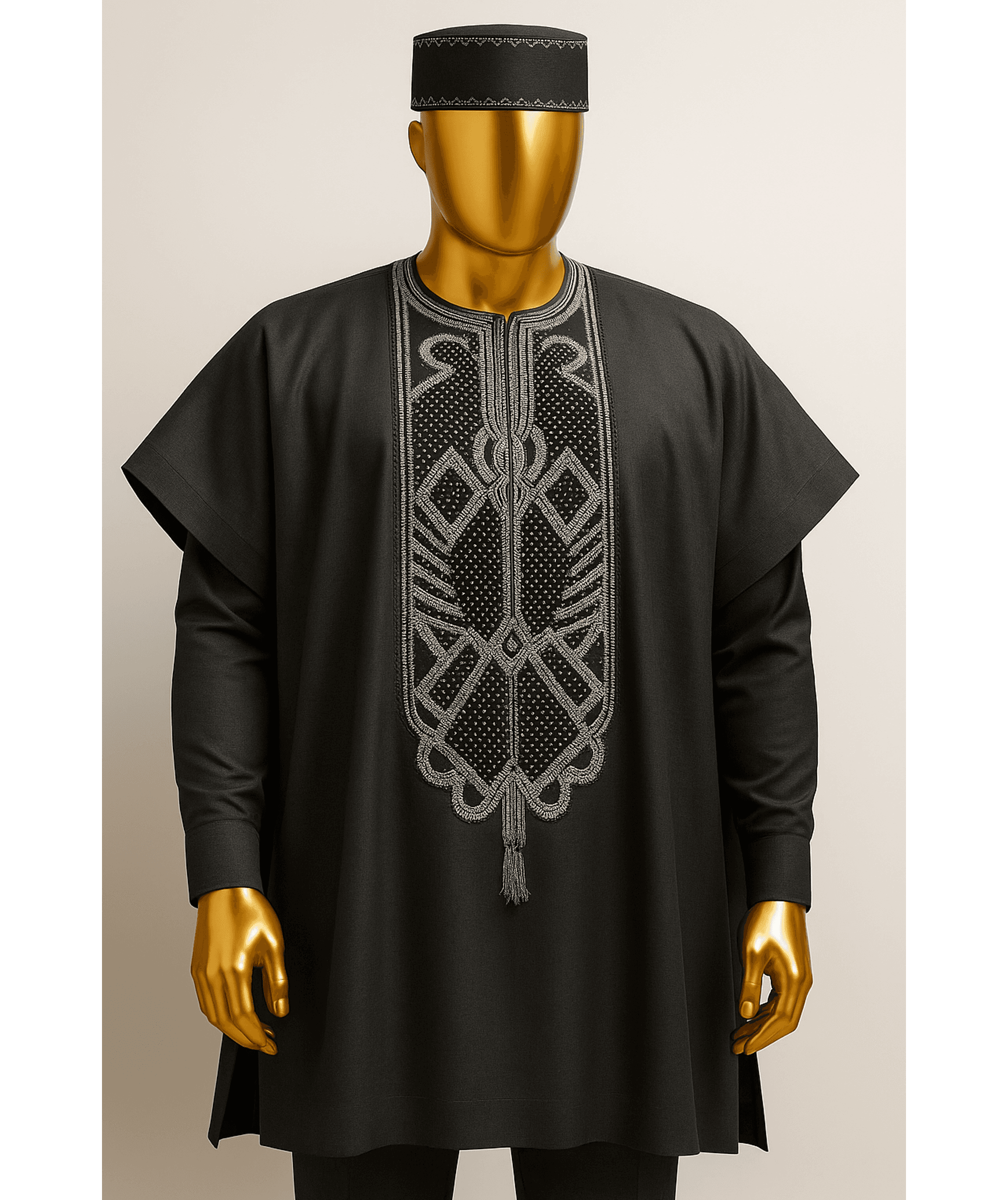 Embrace understated power with this flowing all-black Agbada featuring subtle tonal embroidery down the chest panel. The short-sleeved outer robe drapes majestically while the geometric patterns create dimensional texture through expert needlework on black fabric. Complete with matching black cap, this monochromatic ensemble represents refined minimalism rooted in Nigerian ceremonial tradition. The all-black aesthetic speaks to sophistication, mystery, and commanding presence without relying on bold color contrasts. Perfect for evening events, upscale gatherings, and cultural ceremonies where elegant restraint makes the strongest statement. The tonal embroidery offers visual interest under light while maintaining the clean monochromatic sophistication. This versatile piece transitions beautifully across formal and semi-formal occasions, making it essential for the discerning wardrobe.