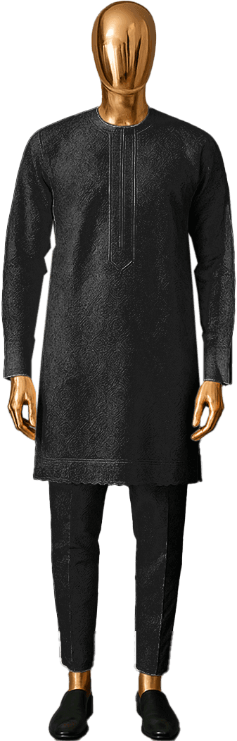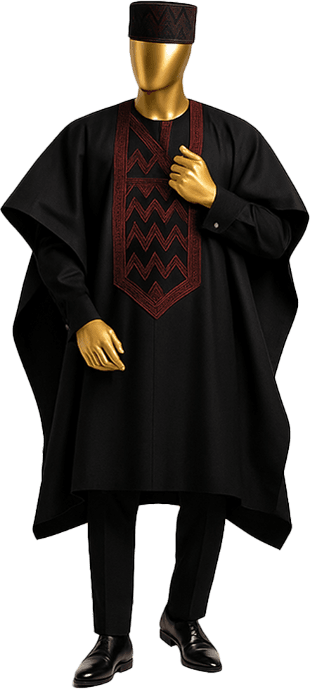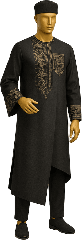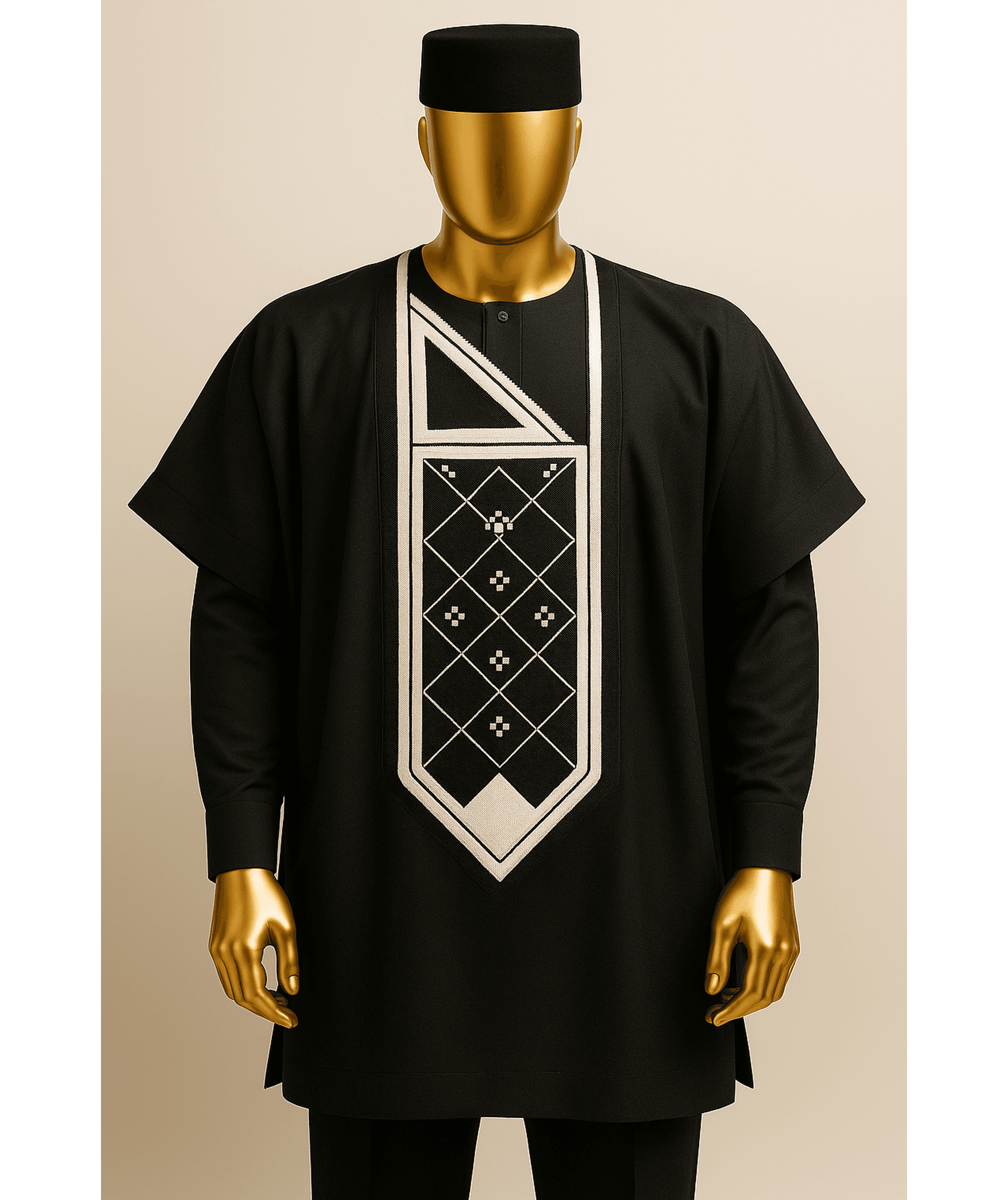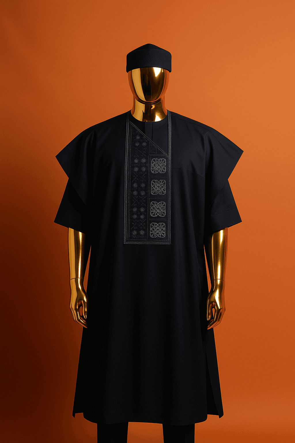 Embrace understated power with this flowing all-black Agbada featuring subtle tonal embroidery down the chest panel. The short-sleeved outer robe drapes majestically while the geometric patterns create dimensional texture through expert needlework on black fabric. Complete with matching black cap, this monochromatic ensemble represents refined minimalism rooted in Nigerian ceremonial tradition. The all-black aesthetic speaks to sophistication, mystery, and commanding presence without relying on bold color contrasts. Perfect for evening events, upscale gatherings, and cultural ceremonies where elegant restraint makes the strongest statement. The tonal embroidery offers visual interest under light while maintaining the clean monochromatic sophistication. This versatile piece transitions beautifully across formal and semi-formal occasions, making it essential for the discerning wardrobe.