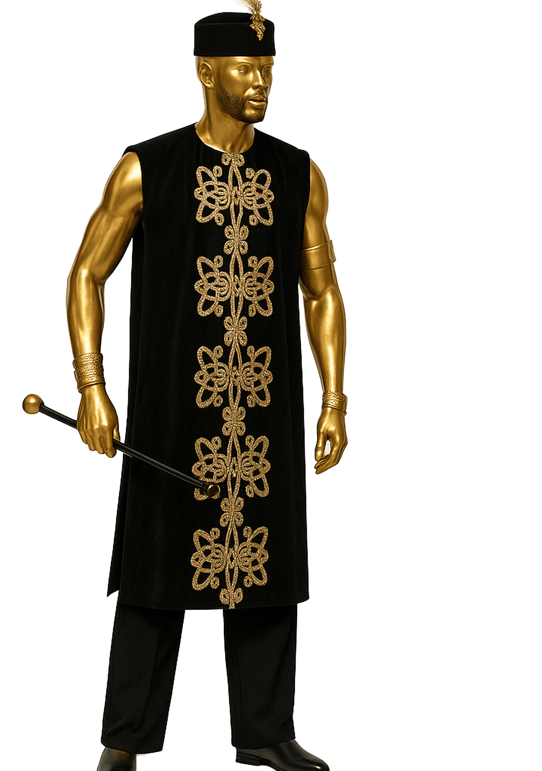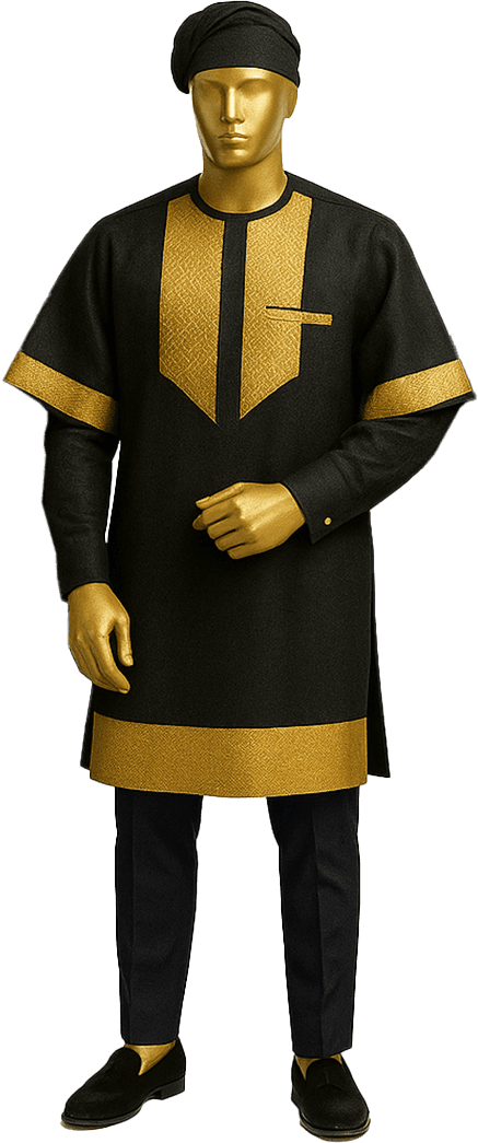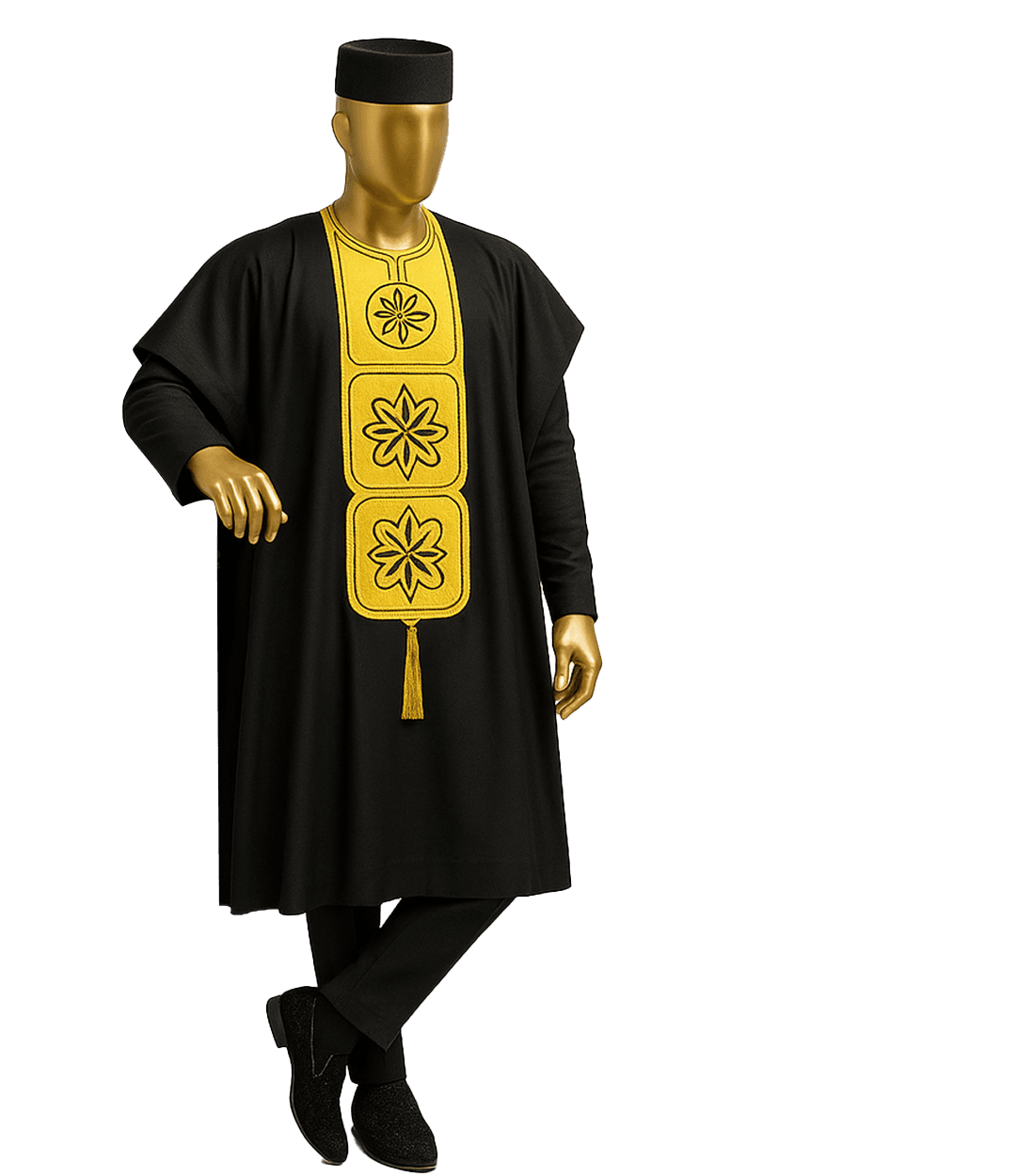Make a bold, fashion-forward statement with this striking sleeveless black Agbada featuring stunning gold embroidered medallions. This contemporary three-piece set reimagines traditional Nigerian attire with a modern, athletic-inspired twist, designed for the confident gentleman who embraces innovation while honoring heritage. The outfit showcases a dramatic sleeveless Agbada in rich black fabric, adorned with five elaborate gold embroidered medallions running vertically down the center front. Each intricate floral-geometric design is meticulously crafted, creating a luxurious visual statement against the deep black base. The sleeveless design offers a contemporary, bold silhouette while maintaining traditional length and flow. Complete with matching black trousers and a coordinating black Kufi cap with gold accent, this ensemble delivers powerful, modern elegance.