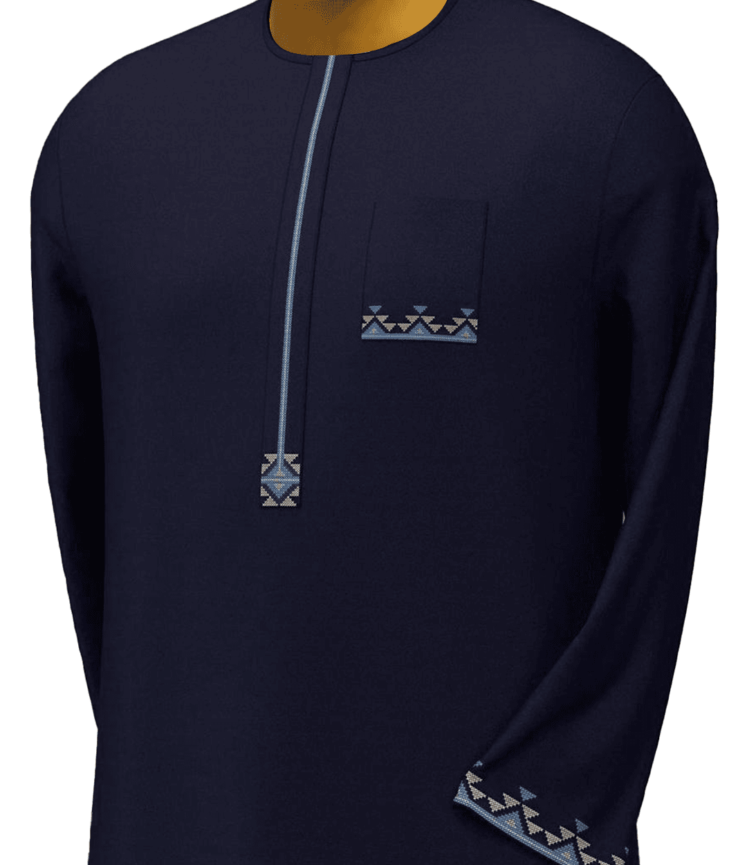 Discover refined detailing with this elegant navy blue Kaftan featuring subtle sky blue Aztec-inspired geometric embroidery. This sophisticated design showcases the perfect balance of minimalism and cultural artistry, ideal for the gentleman who appreciates understated embellishments and thoughtful details. This refined Kaftan detail highlights deep navy blue fabric accented by delicate sky blue embroidered geometric patterns in Aztec-inspired designs on the chest pocket and cuff trim. The subtle contrast embroidery adds just enough visual interest without overwhelming the sophisticated navy base. The round neckline with clean placket maintains classic proportions while the long sleeves offer coverage and elegance. Perfect for religious services, formal ceremonies, business-casual cultural events, and occasions requiring polished sophistication with cultural nods. The navy blue conveys authority and professionalism while the geometric accents add personality. Part of a complete two-piece ensemble with matching trousers. Custom-tailored to your exact measurements.