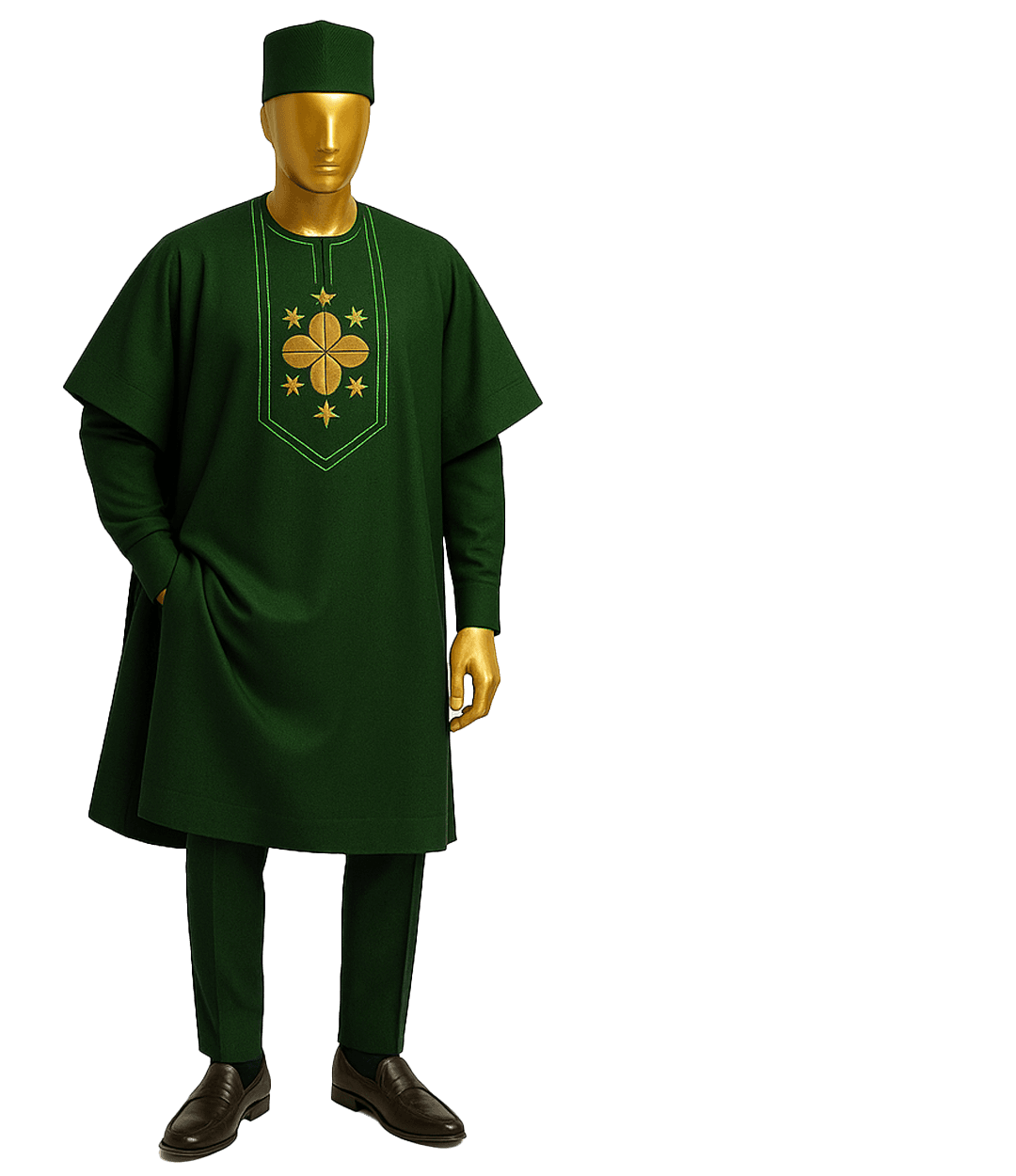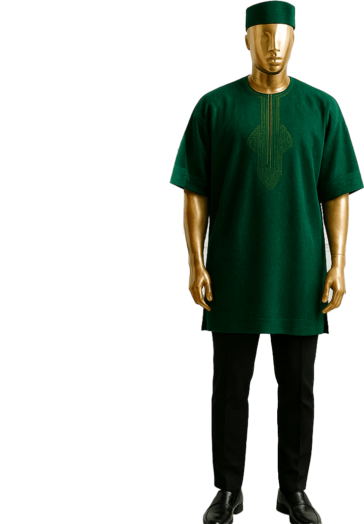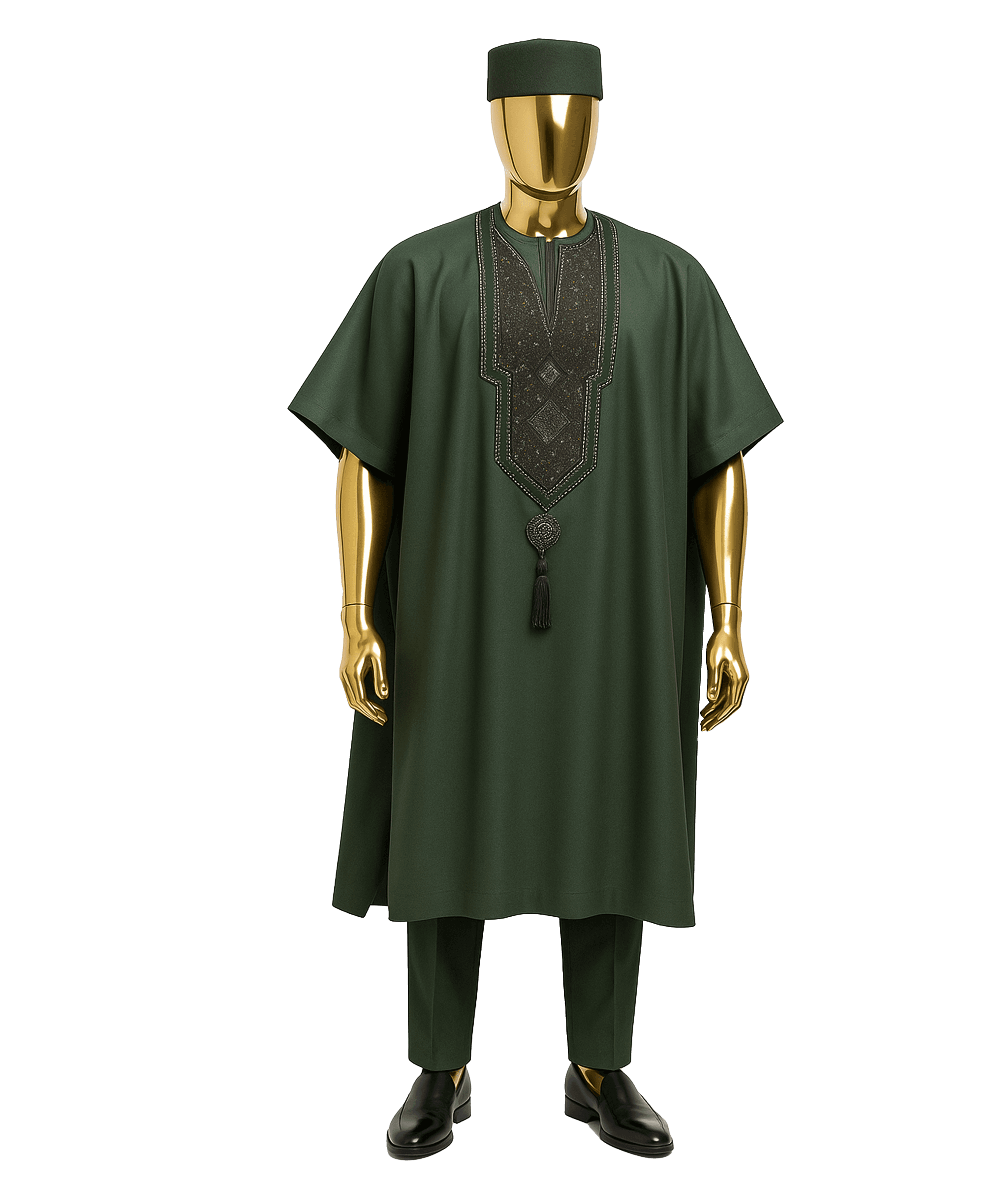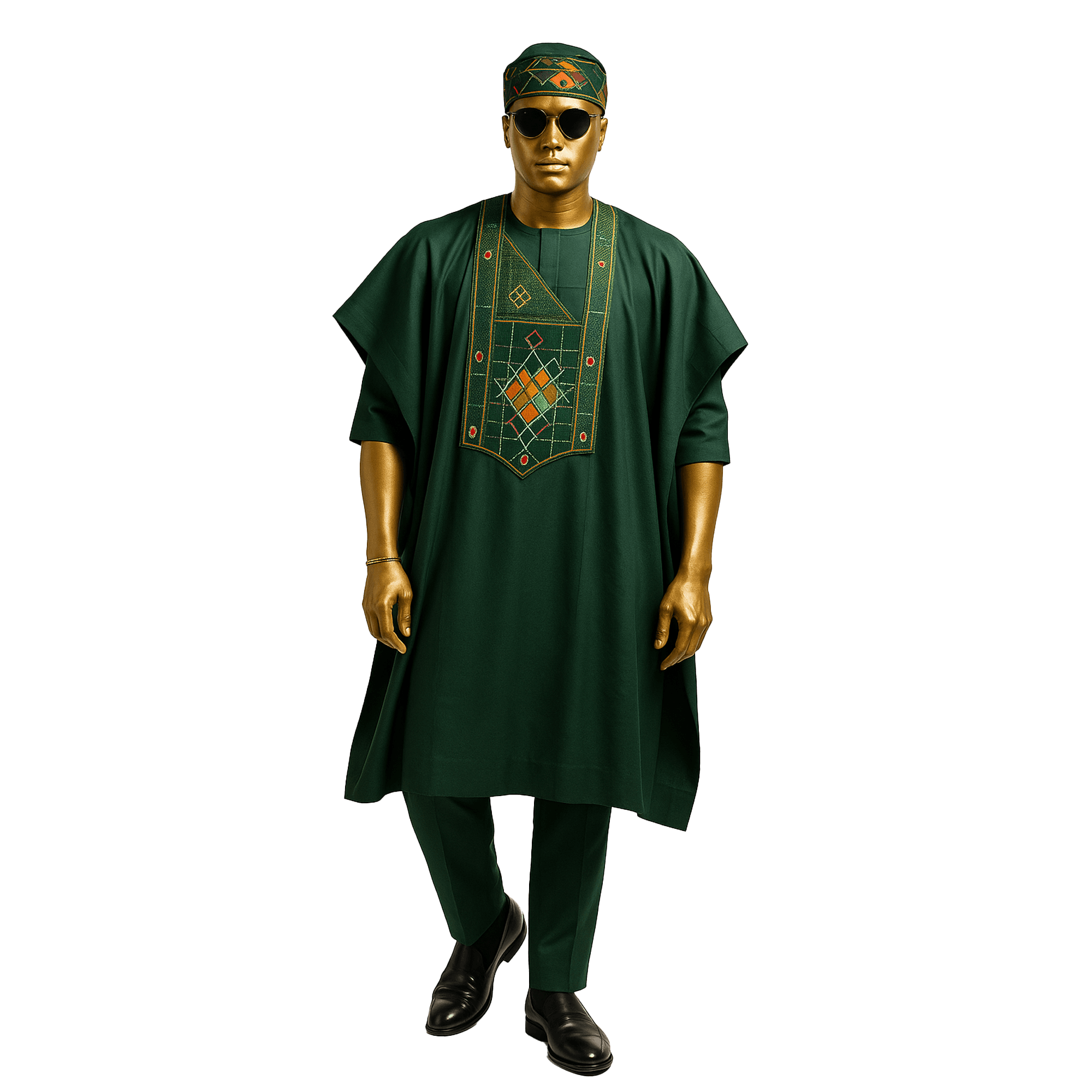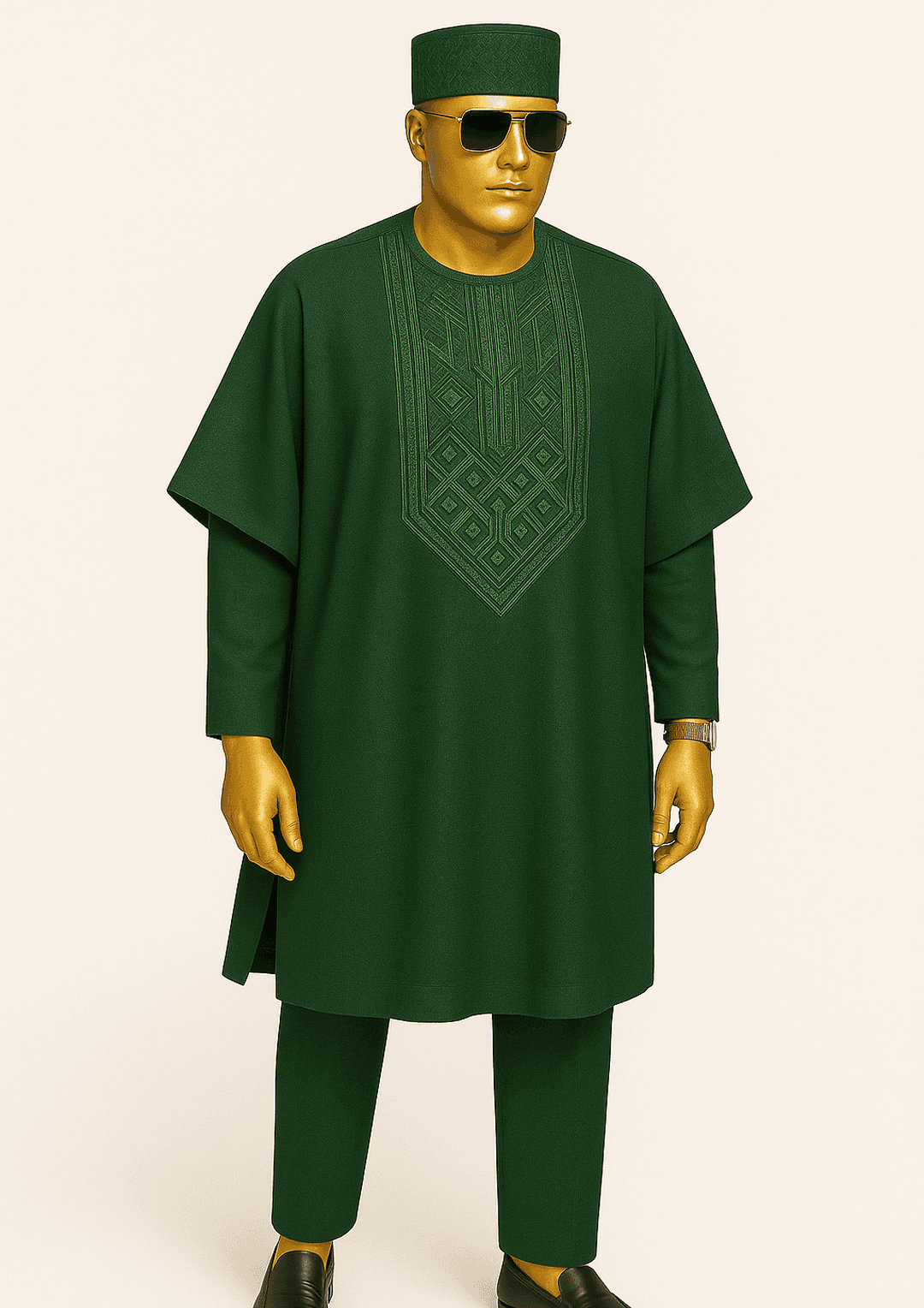 Immerse yourself in regal sophistication with this luxurious forest green Agbada ensemble that embodies the essence of Nigerian nobility. The flowing short-sleeved design features exquisite tonal embroidery across the chest panel, showcasing intricate geometric patterns that have been passed down through generations of Nigerian textile artistry. The wide silhouette creates a commanding presence while offering unparalleled comfort and ease of movement—essential qualities for celebrations that last from afternoon into night. The matching cap completes this three-piece set, featuring coordinating embroidery that ties the entire look together with cultural authenticity. This ensemble represents more than fashion—it's a celebration of identity, heritage, and the timeless elegance of African traditional wear. The rich emerald tone symbolizes growth, prosperity, and connection to the land, making it particularly meaningful for cultural festivals, traditional weddings, and milestone celebrations. Pair with matching trousers and leather sandals for an authentic look that honors your roots while embracing contemporary style. The breathable fabric ensures comfort throughout extended wear, while the expert tailoring guarantees you'll look distinguished from every angle.