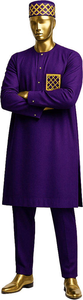 Vibrant royal purple long-sleeved senator set with golden embroidered chest pocket accent. The fitted top features round neckline with delicate button placket and sleek contemporary silhouette. Eye-catching golden lattice-embroidered chest pocket creates focal point against the rich purple base. Paired with coordinating royal purple trousers for complete tonal elegance. Styled with matching embroidered traditional cap featuring golden geometric pattern. Made from quality solid fabric with expert embroidery detailing. The jewel-toned purple paired with metallic golden accent offers sophisticated color combination. Clean modern lines maintain contemporary appeal. Great for cultural events, business-formal occasions, upscale gatherings, celebrations, or refined everyday styling.