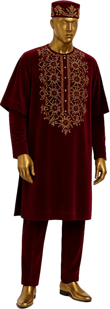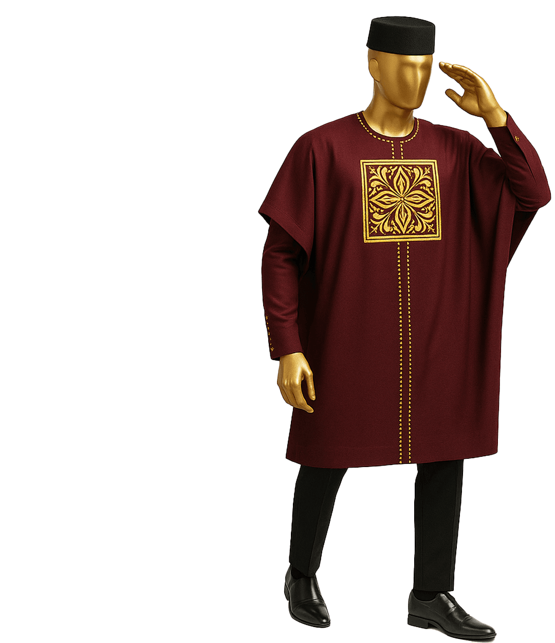 Majestic deep burgundy short-sleeved agbada with dramatic wide sleeves and extensive golden embroidery covering the chest. Premium luxurious fabric with flowing silhouette creating commanding presence. Complete with matching embroidered fila. The elaborate gold threadwork showcases exceptional craftsmanship. This is maximum traditional impact—the flowing agbada represents authority while the lavish embroidery demonstrates cultural investment. Every detail communicates prestige and heritage pride. Perfect for grand traditional weddings, chieftaincy installations, cultural coronations, high-society events, milestone celebrations, or occasions where you represent the pinnacle of tradition.