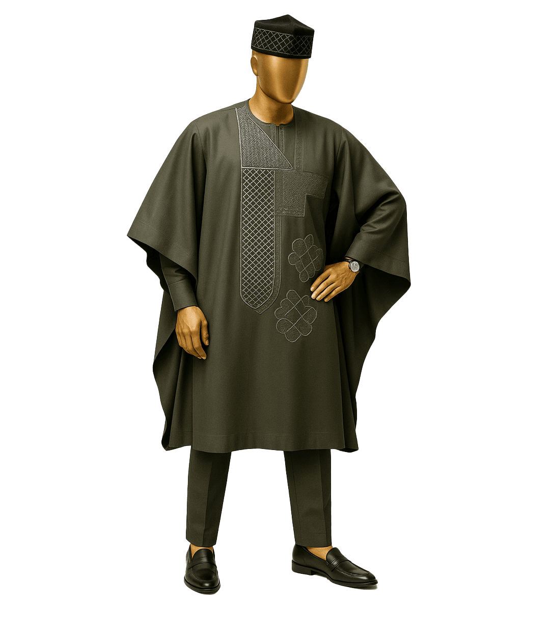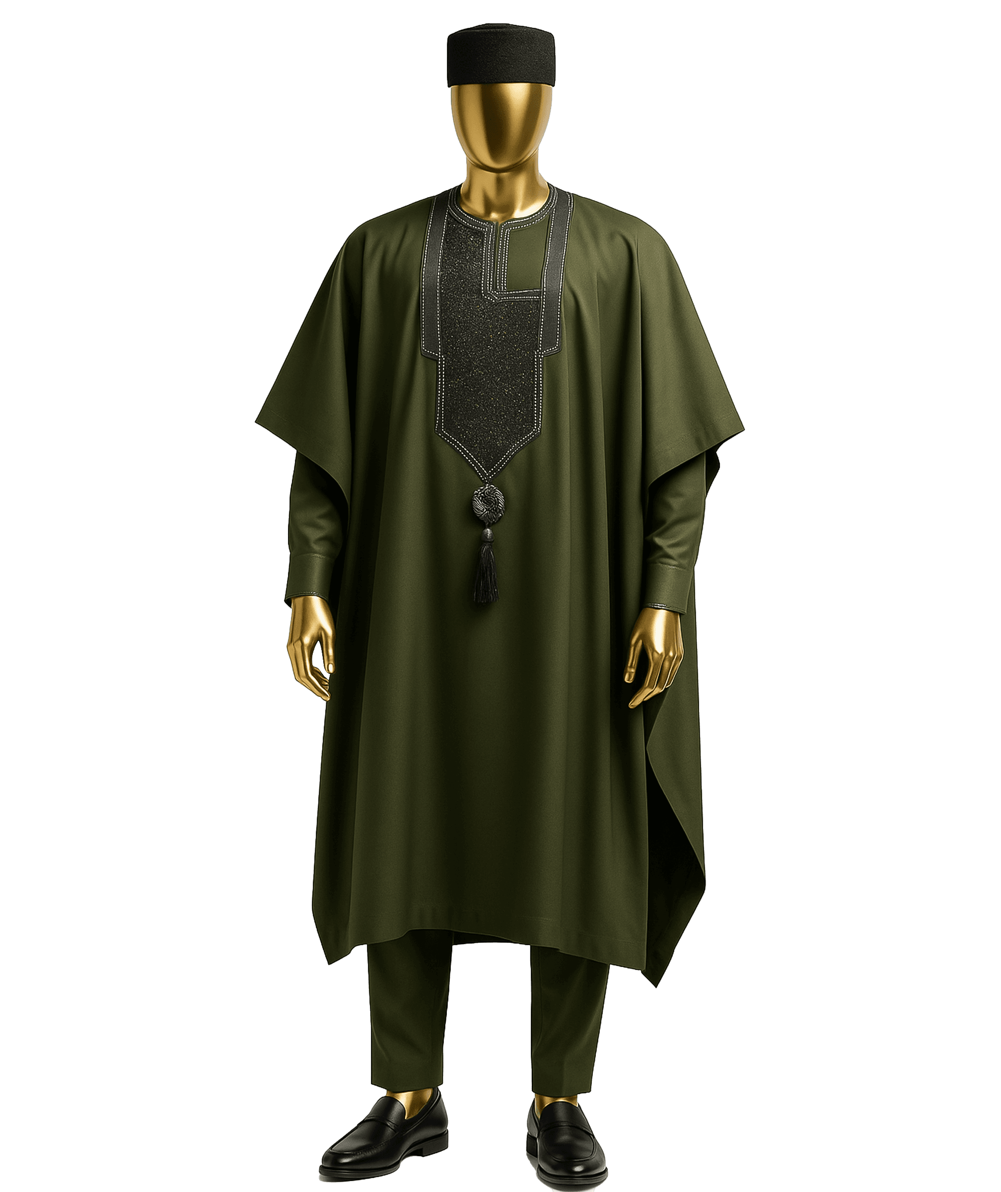Stand tall in this deep olive green flowing Agbada complete with embroidered chest panel and matching cap. The commanding silhouette and earth-toned palette represent strength, wisdom, and deep connection to cultural heritage. This traditional masterpiece is ideal for weddings, community celebrations, and events where making a memorable impression matters. The flowing design ensures comfort without compromising on regal presence.