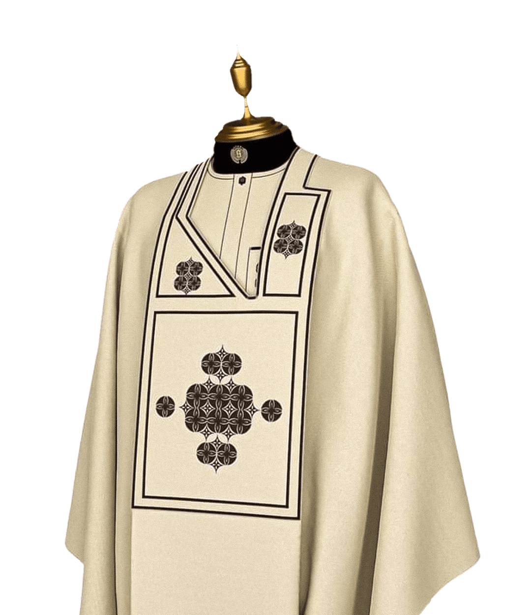 Experience architectural elegance with this stunning cream Agbada featuring bold black geometric embroidery in a card suit-inspired pattern. This luxurious piece combines pristine neutral tones with striking graphic design, perfect for the gentleman who appreciates artistic symmetry and sophisticated contrast. This impressive Agbada showcases soft cream fabric elevated by dramatic black embroidered geometric designs arranged in rectangular panels across the chest and body. The pattern features circular floral medallions arranged like playing card suits, creating a unique, contemporary aesthetic. Diagonal piping lines frame the design elements, adding structure and visual movement. The traditional wide-sleeve design creates commanding presence. This statement piece works beautifully for high-fashion events, avant-garde weddings, creative industry gatherings, and occasions where you want to blend traditional silhouette with modern artistic expression. The cream and black combination offers timeless sophistication with contemporary edge. Custom-tailored to your exact measurements for impeccable fit.