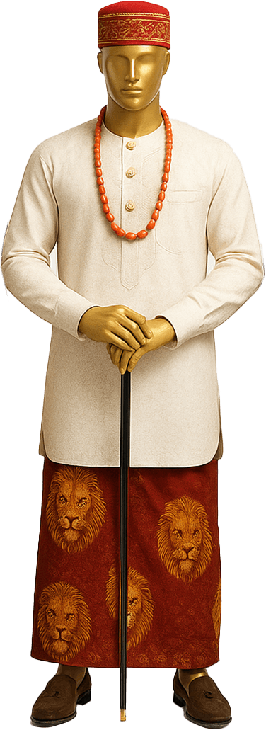 Elegant ivory long-sleeved buba paired with luxurious burgundy lion-embroidered wrapper sokoto. The cream top creates clean sophistication while the rich burgundy wrapper features golden lion heads symbolizing strength. Complete with ornate red cap with gold embroidery trim, traditional coral beads, and ceremonial walking stick. This two-tone combination is bold yet refined—the contrast between pristine ivory and regal burgundy creates visual drama. The lion motifs add symbolic power to your presence. This is heritage royalty at its finest. Perfect for traditional engagement ceremonies, chieftaincy events, cultural coronations, high-profile weddings, or occasions demanding distinguished traditional presence.