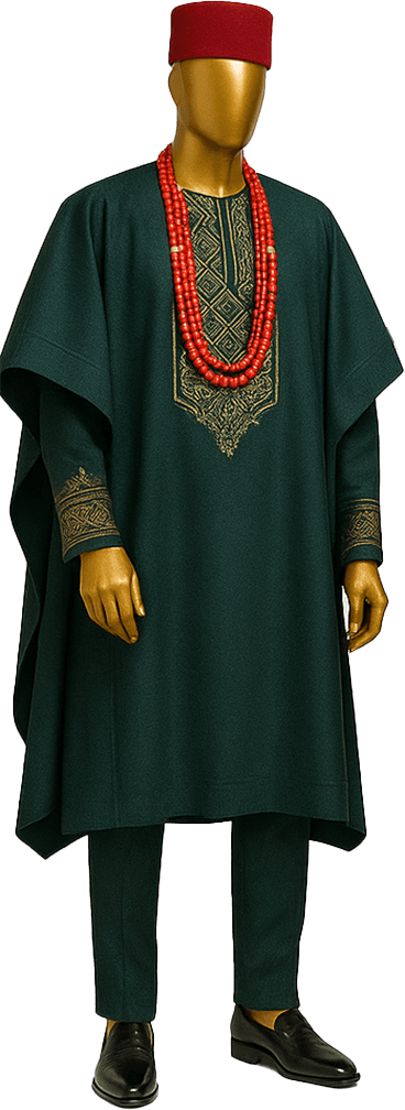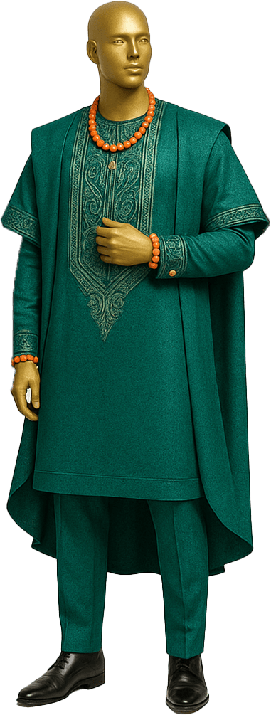 Command majestic presence with this stunning emerald teal Agbada featuring intricate tonal embroidery and luxurious color depth. This magnificent four-piece set embodies regal sophistication, perfect for the gentleman who embraces bold jewel tones and ornate craftsmanship. This spectacular outfit showcases a short-sleeved Agbada in rich emerald teal fabric, adorned with elaborate tonal embroidery featuring botanical leaf designs cascading down the chest and geometric border patterns on the sleeves. The teal-on-teal embroidery creates sophisticated depth and texture. Styled with orange coral beaded necklaces that create stunning color contrast. The sleeveless outer Agbada layer adds dramatic flow and presence. Complete with matching emerald teal trousers and inner long-sleeved top, this complete ensemble delivers powerful elegance for high-profile weddings, chieftaincy installations, cultural showcases, and prestigious gatherings. The emerald teal symbolizes growth, prosperity, and regal confidence. Custom-tailored to your exact measurements.