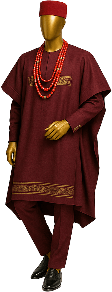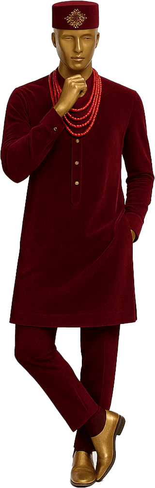 Stunning deep burgundy long-sleeved buba in luxurious solid fabric with button-front placket detail. Features layered coral beads and matching embroidered fila with gold sunburst motif. The rich wine color exudes sophistication and cultural authority. Clean silhouette with impeccable tailoring. Includes coordinating sokoto. The combination of deep burgundy and traditional coral beads creates powerful visual harmony rooted in cultural symbolism. This is refined masculinity and cultural pride in perfect balance. Perfect for traditional engagements, cultural ceremonies, family milestone events, upscale Owambe parties, or occasions where you represent family honor and tradition.