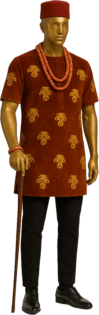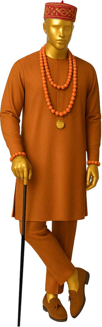 Rich burnt orange long-sleeved senator ensemble in luxurious solid fabric. Features clean lines, mandarin collar, and impeccable tailoring. Complete with burgundy cap, traditional multi-strand coral beads, golden pendant, and ceremonial walking stick for full cultural authenticity. The warm amber-orange color radiates energy and cultural pride. This color is bold yet refined, standing out while maintaining sophistication. The complete traditional accessories elevate the ensemble to ceremonial status. Ideal for traditional weddings, cultural leadership events, ceremonial gatherings, milestone celebrations, or occasions demanding full traditional regalia with commanding presence.