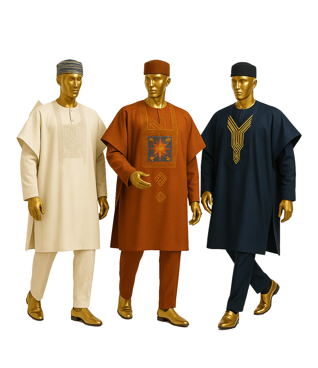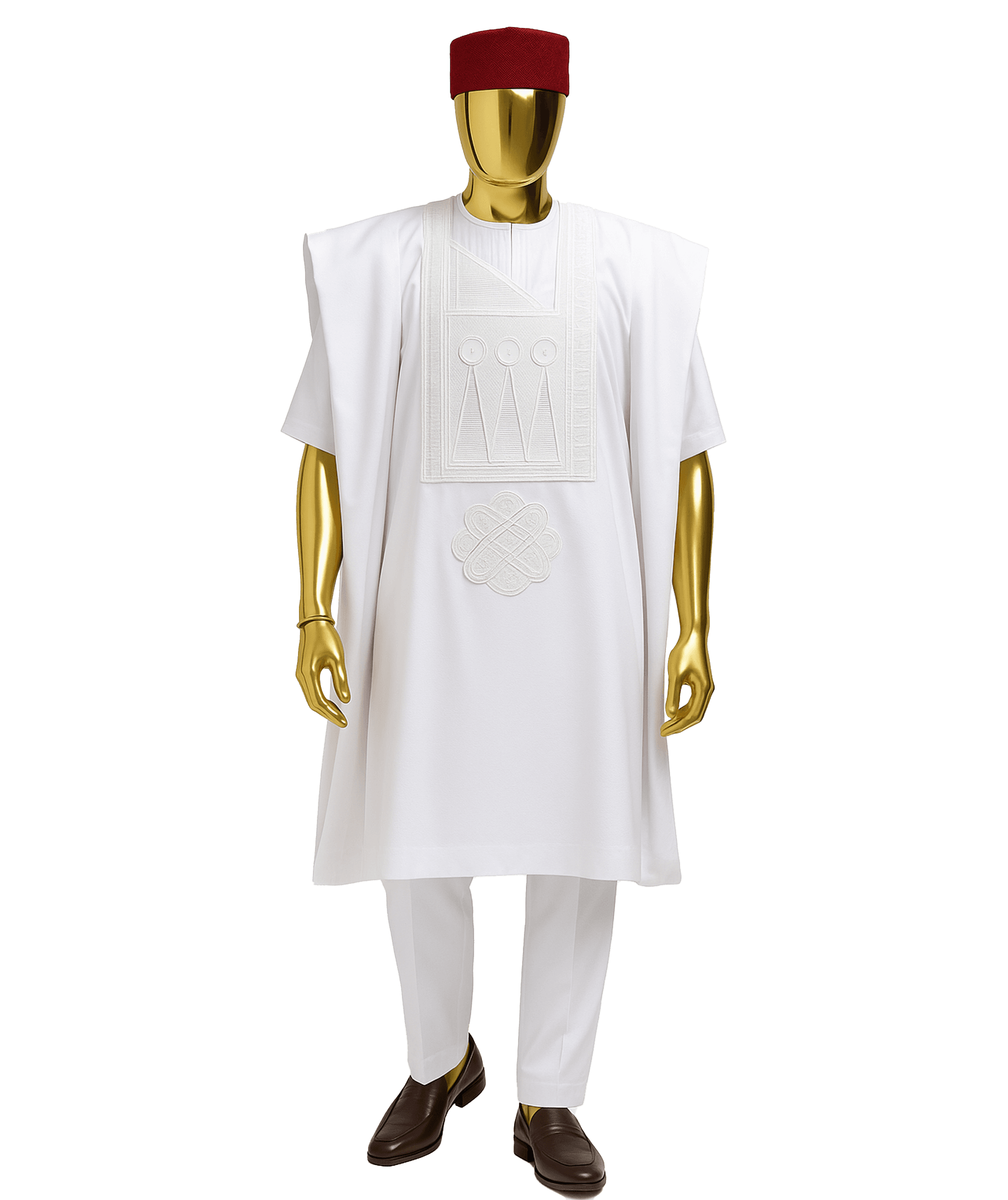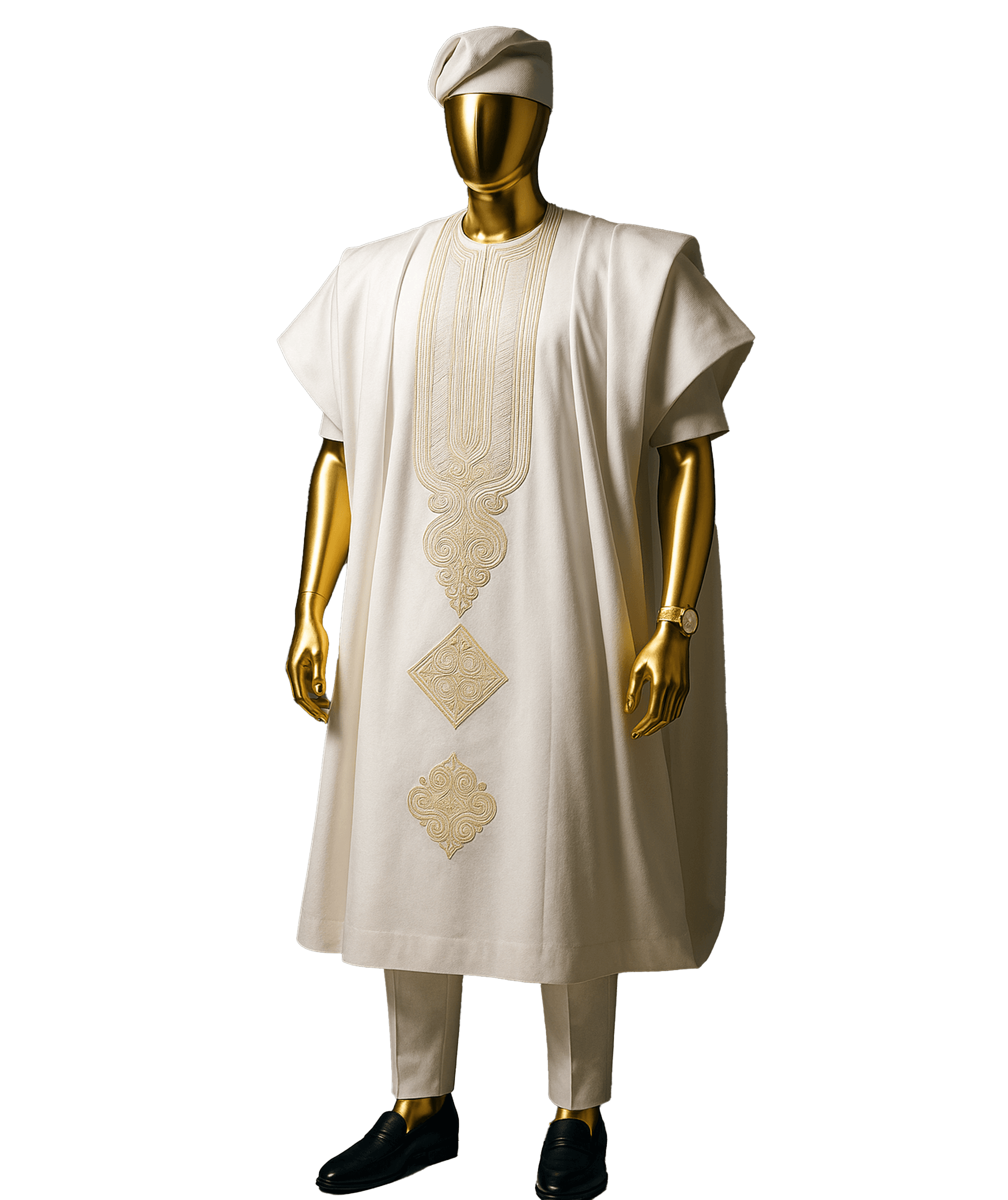 Elevate your wardrobe with our Heritage Royale Agbada Set, a stunning three-piece ensemble that celebrates Nigerian craftsmanship and timeless elegance. Each set features a flowing agbada top with intricate embroidered detailing, matching trousers, and a coordinating traditional cap (fila). Crafted from premium quality fabric, this versatile outfit is perfect for weddings, cultural celebrations, religious ceremonies, or any occasion where you want to make a distinguished statement. The authentic embroidery work showcases traditional Nigerian patterns, blending heritage with contemporary sophistication. Available in three sophisticated colorways: Ivory Cream with tonal embroidery, Rich Terracotta with geometric star motifs, and Deep Navy with gold geometric accents. Each piece is designed for comfort and style, featuring breathable fabric and a relaxed, regal fit. Complete set includes: Embroidered agbada top, matching trousers, and traditional cap. Elevate your wardrobe with our Heritage Royale Agbada Set