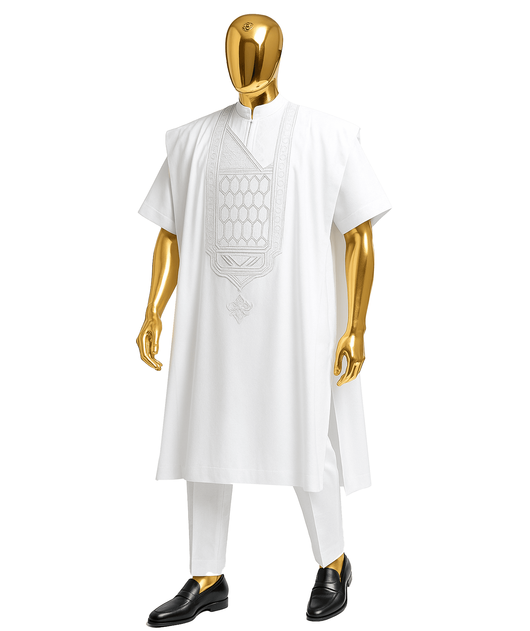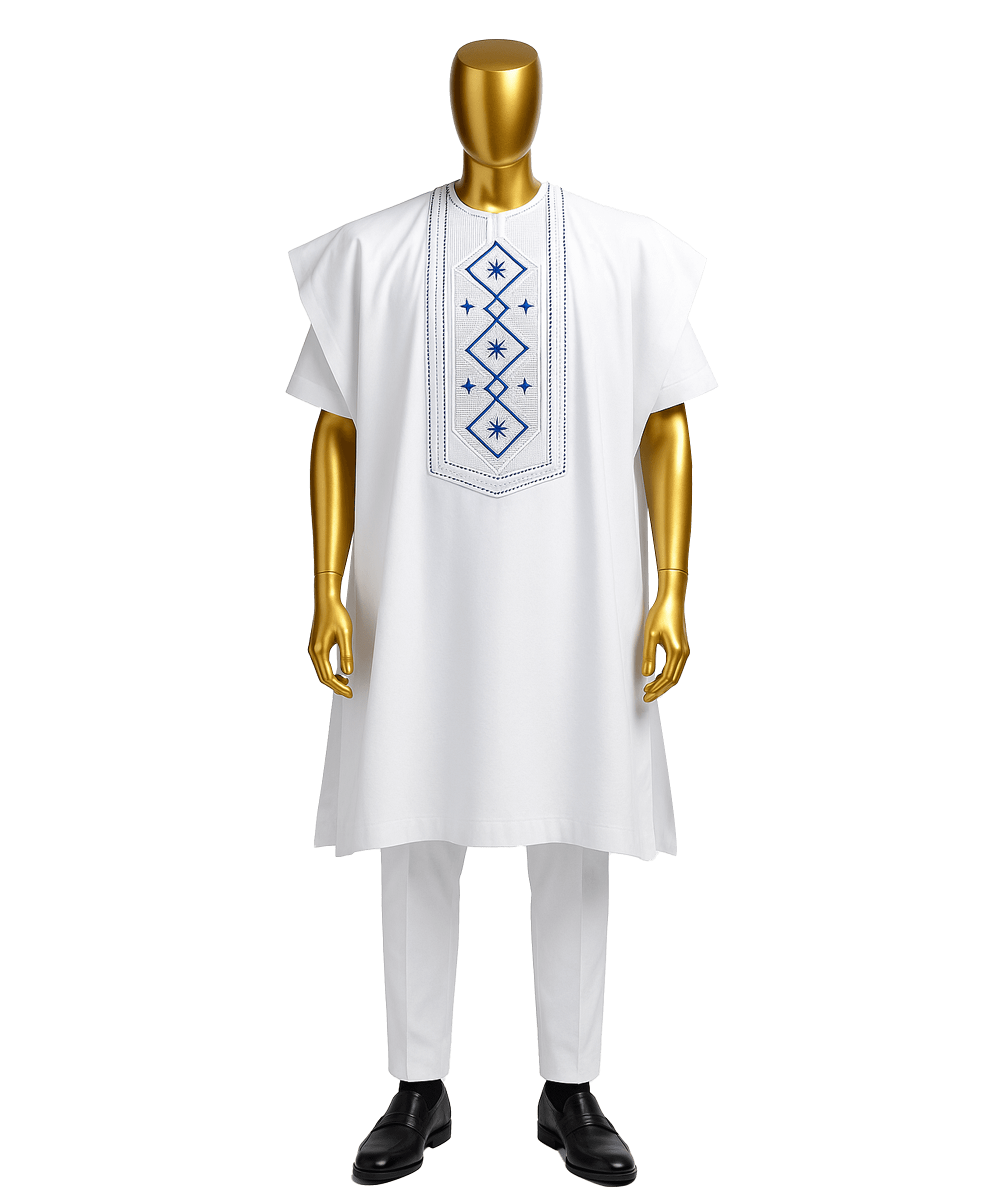 Discover serene elegance with this pristine all-white short-sleeved Agbada featuring delicate blue geometric embroidery on the chest. The crisp white fabric creates a canvas for the intricate blue needlework—diamond patterns and crosses that symbolize spirituality, protection, and divine blessing. The flowing silhouette offers comfort and commanding presence, while the subtle color contrast maintains sophisticated restraint. This two-piece ensemble, tunic and trousers, represents purity, new beginnings, and spiritual clarity across Nigerian cultures. Perfect for religious ceremonies, naming celebrations, and sacred gatherings where honoring tradition with reverence matters. The lightweight construction ensures comfort during extended wear while maintaining impeccable structure. Style with white or brown leather footwear and minimal accessories to preserve the clean aesthetic.
