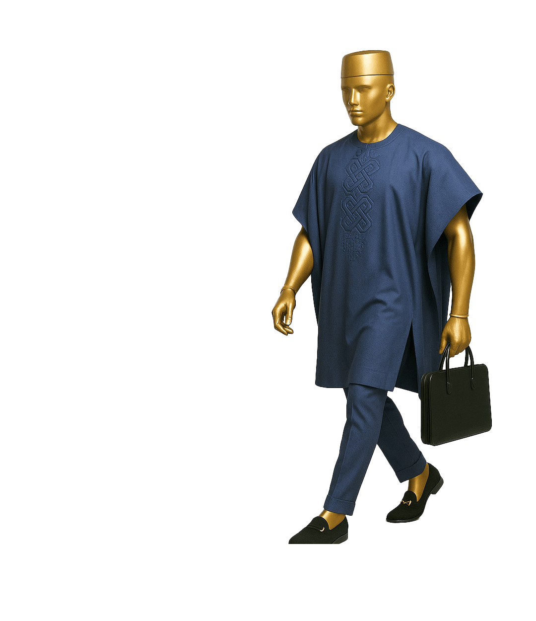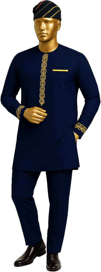 Distinguished navy blue long-sleeved senator with refined golden embroidery on center placket and cuff details. Premium solid fabric with button-front design and chest pocket accent. Complete with matching traditional striped cap. The deep navy creates authoritative sophistication. Includes coordinating sokoto. Navy blue represents wisdom, stability, and quiet authority. The strategic gold embroidery placement creates understated luxury. This is professional traditional wear for the distinguished gentleman. Perfect for corporate-cultural events, business ceremonies, executive gatherings, formal traditional occasions, leadership functions, or projecting cultured authority.