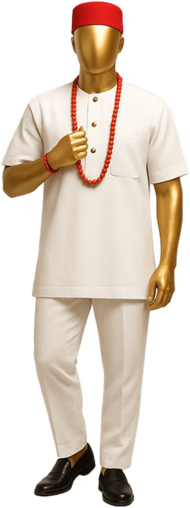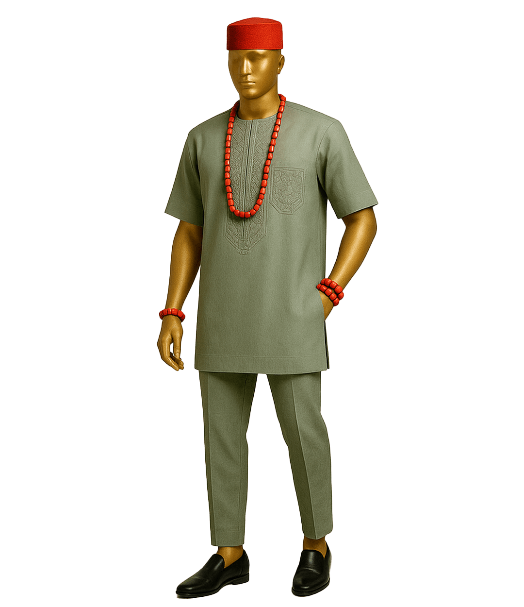 Celebrate Igbo heritage with this sophisticated sage green Senator ensemble featuring traditional embroidered detailing that pays homage to the iconic Isiagu style. This versatile two-piece set combines cultural authenticity with contemporary wearability, perfect for the modern Nigerian gentleman who honors his roots. The outfit features a short-sleeved Senator top in muted sage green fabric, adorned with tonal embroidery on the chest pocket area that echoes traditional lion head motifs in subtle, refined detail. The round neckline and relaxed fit ensure comfortable elegance. Paired with matching straight-leg trousers, this ensemble creates a cohesive, distinguished look. The styling is elevated with a vibrant red traditional cap (Fez/Fila) and coral beads, adding bold cultural accents.