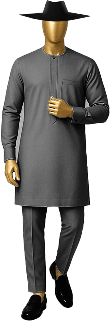 Sleek charcoal grey long-sleeved Senator suit with mandarin collar and concealed placket for ultra-clean lines. No embroidery, no embellishment—just impeccable tailoring and quality fabric. The fitted silhouette creates modern appeal while the charcoal tone offers sophisticated neutrality. Style with matching grey trousers and add a wide-brimmed hat for dramatic flair, or keep it simple. Perfect for the minimalist who appreciates quality over ornamentation. The monochromatic grey creates effortless elegance that transitions across occasions. Add colorful accessories to personalize, or let the clean tailoring speak for itself.