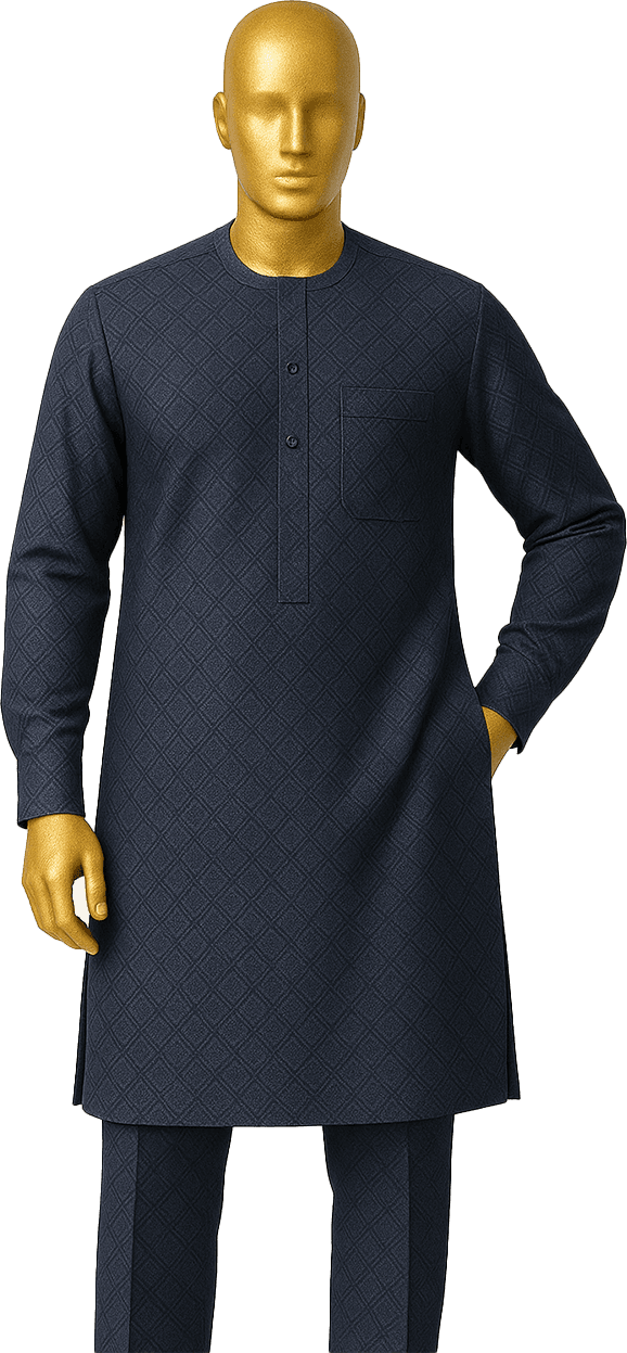 Sophisticated charcoal navy senator suit in luxurious textured fabric with subtle diamond crosshatch pattern throughout. Features mandarin collar with refined button placket detail, long sleeves, and a sleek modern silhouette. The all-over texture adds depth and dimension to the solid tone. Includes matching trousers. This is understated luxury for the discerning gentleman. The deep charcoal color exudes authority while the textured fabric elevates it beyond ordinary. No embellishments needed—the quality speaks for itself. Perfect for corporate events, executive meetings, evening receptions, upscale dinners, or anytime you want to project sophistication and quiet confidence.