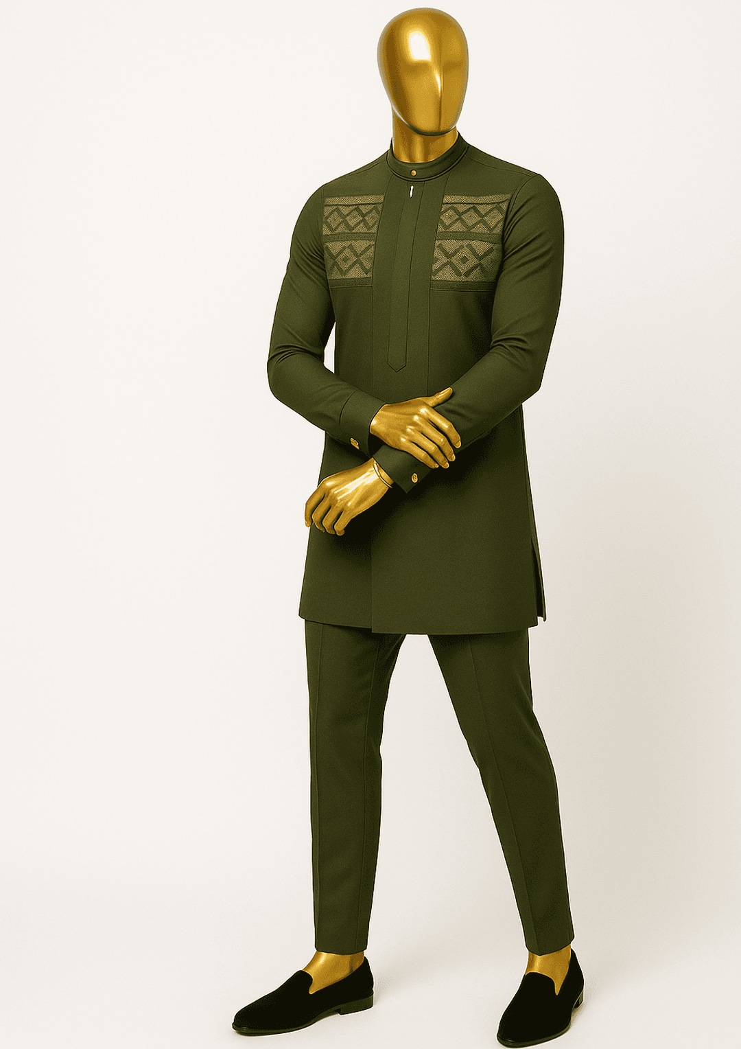 Merge contemporary style with traditional roots in this military-inspired olive green ensemble featuring a modern zippered tunic with geometric shoulder detailing. The fitted silhouette and earthy tone create versatile sophistication that transitions seamlessly from daytime cultural events to evening celebrations. This set is designed for the fashion-forward man who appreciates innovation within tradition.