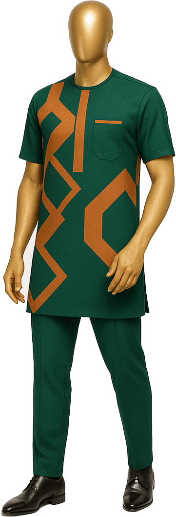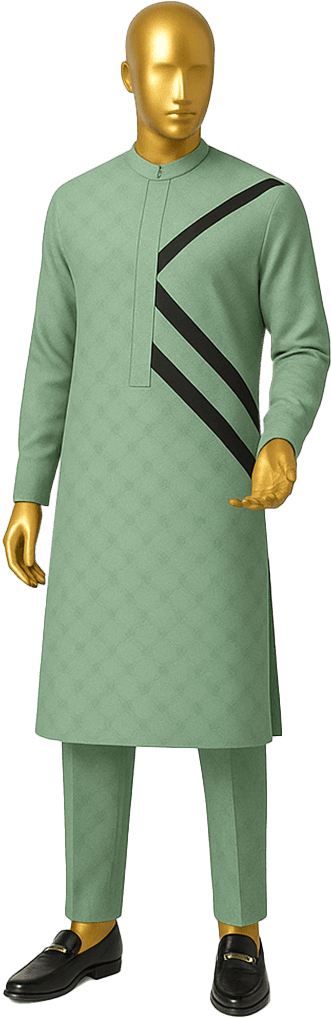 Contemporary sage green long-sleeved senator featuring bold diagonal black stripes across the chest. Premium solid fabric with graphic modern design element. The striking contrast creates architectural visual interest. Includes matching green sokoto. This is tradition reimagined through modern design lens. The sage color is calming yet confident, while the bold black stripes add edgy contemporary flair. Perfect for the progressive traditionalist. Ideal for modern weddings, contemporary cultural events, fashion-forward celebrations, creative industry functions, or occasions where you want to honor heritage while showcasing modern African aesthetic.
