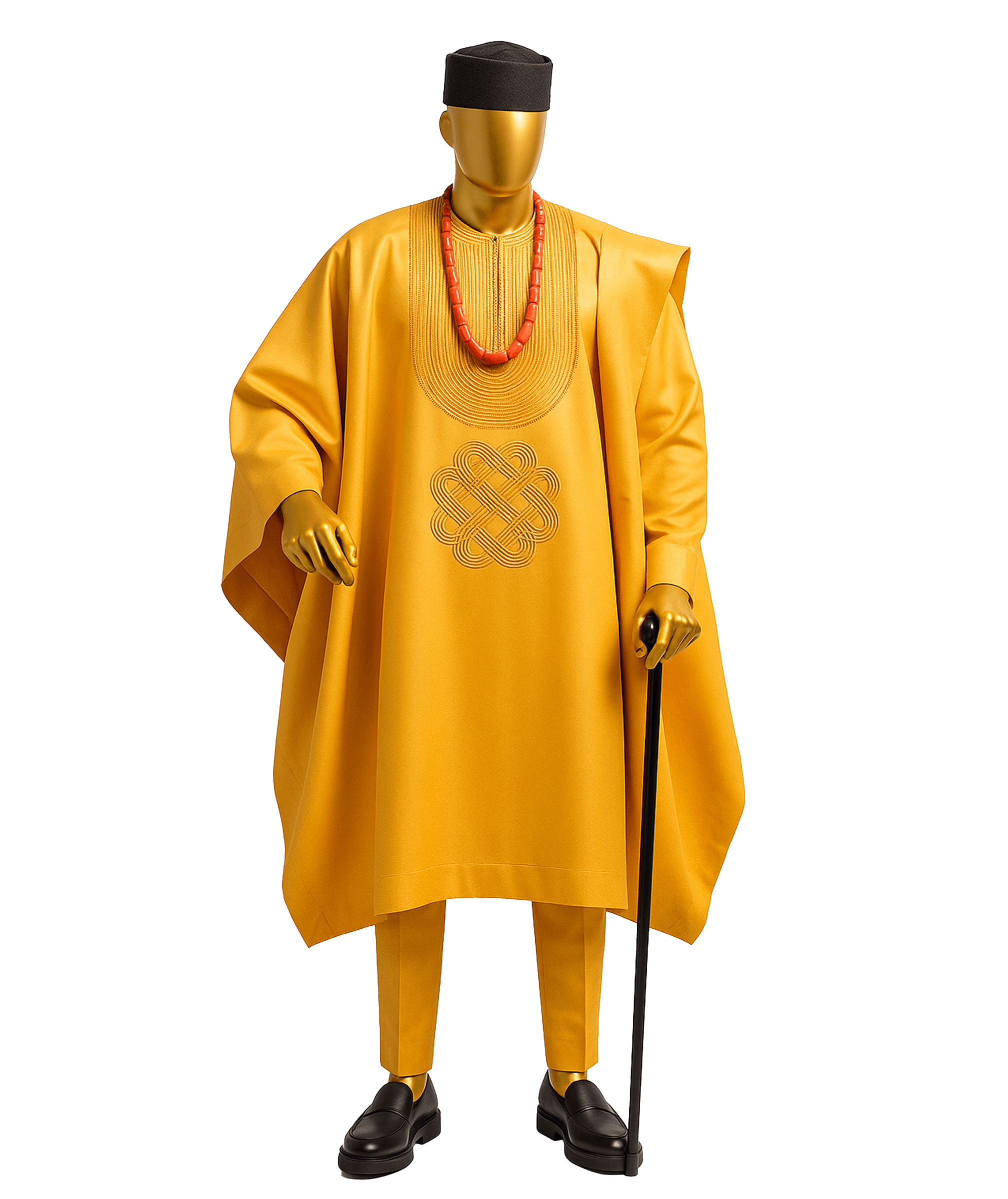 Command absolute attention with this breathtaking golden yellow Agbada ensemble featuring subtle tonal embroidery and dramatic flowing silhouette. This magnificent four-piece set represents the pinnacle of Nigerian ceremonial attire, designed for the gentleman who understands that some moments demand nothing less than spectacular. This stunning outfit showcases a short-sleeved Agbada in radiant golden yellow fabric, adorned with elegant tonal embroidery featuring an infinity knot design on the chest that symbolizes eternal prosperity and unity. The traditional wide-sleeve design creates impressive, regal flow and movement. The rich golden hue radiates wealth, joy, and cultural celebration. Complete with matching golden yellow trousers, inner top, and a coordinating black Kufi cap, this complete ensemble delivers unmatched visual impact for royal weddings, chieftaincy ceremonies, milestone celebrations, coronations, and life's most prestigious moments. The bold golden color makes this perfect for grooms, celebrants, and honored guests who want to shine. Custom-tailored to your exact measurements with traditional walking stick completing the distinguished look.