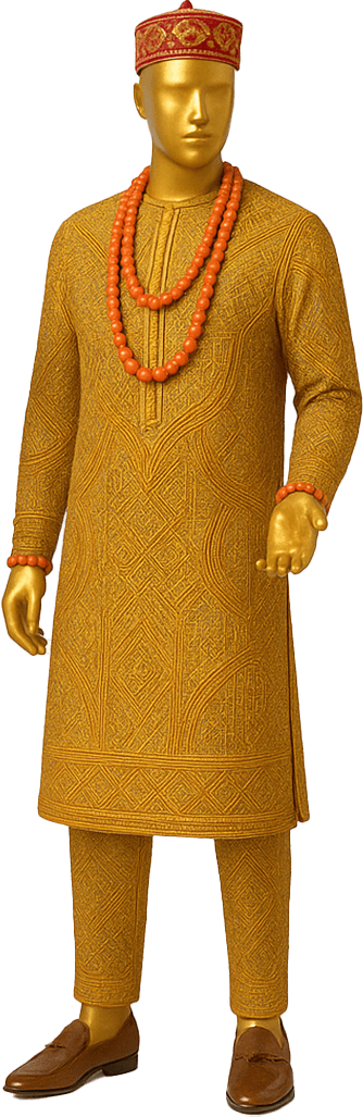 Spectacular golden-yellow senator set covered in all-over intricate geometric embroidery. Long-sleeved design in premium fabric with extensive threadwork creating luxurious texture throughout. Complete with burgundy cap featuring gold trim and multi-strand coral beads. Includes matching embroidered sokoto. This is maximum craftsmanship and cultural opulence. The golden color symbolizes prosperity and royalty while the comprehensive embroidery showcases master artisanship. Every inch speaks of quality and heritage. This is heirloom-quality traditional wear. Perfect for royal weddings, chieftaincy installations, prestigious cultural ceremonies, landmark celebrations, or occasions demanding the absolute finest in traditional attire.