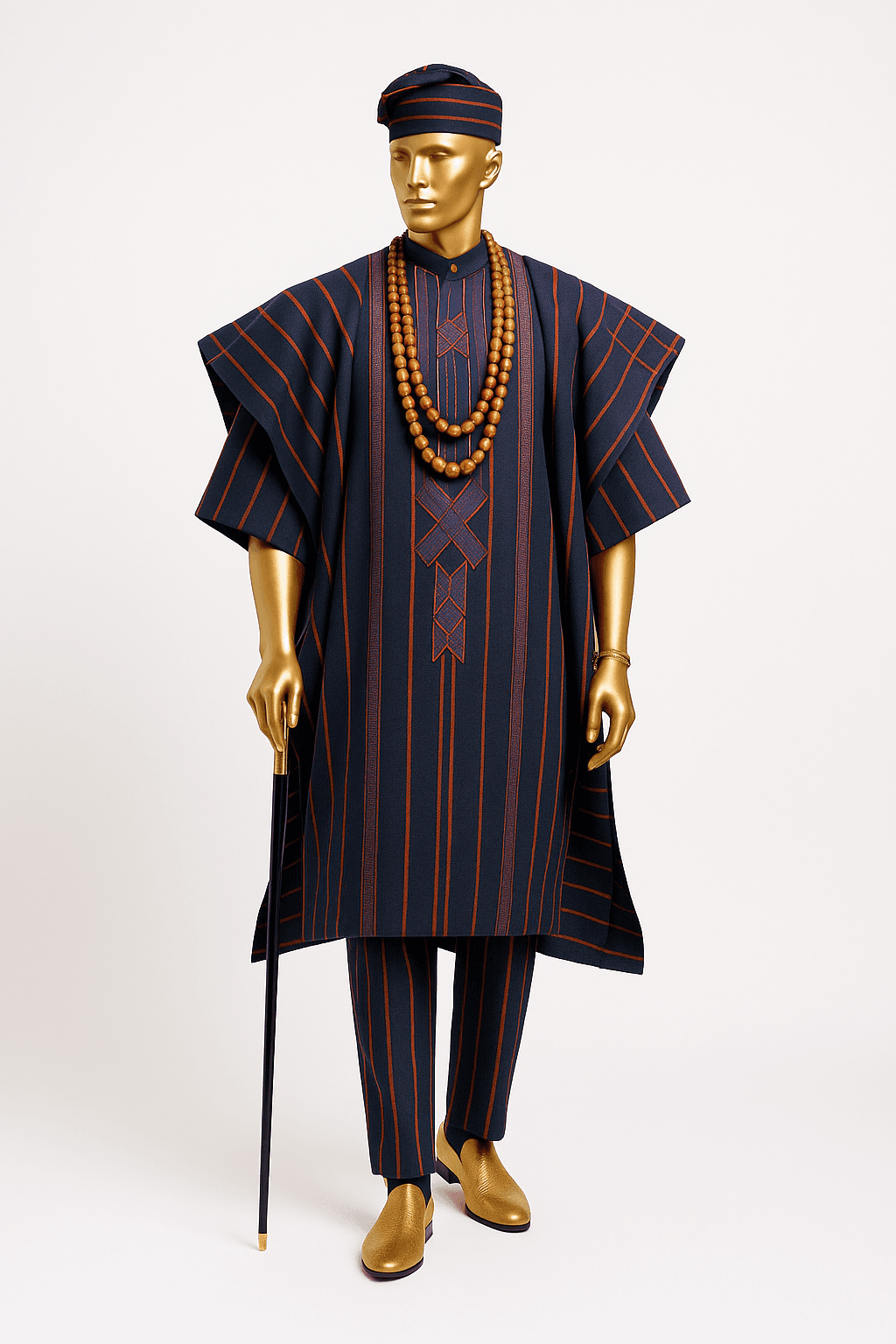 Honor Lagos cultural heritage with this magnificent navy and burgundy striped Agbada inspired by the iconic Eyo masquerade tradition. The flowing short-sleeved robe features vertical multicolored stripes with burgundy diamond embroidery down the chest panel, creating dynamic visual movement. Complete with matching striped trousers, cap, coral beads, and ceremonial walking staff, this ensemble embodies the pageantry and spiritual depth of Yoruba ceremonial dress. This three-piece set with accessories represents more than fashion—it's cultural storytelling through fabric. Perfect for traditional weddings, chieftaincy ceremonies, and cultural festivals where celebrating Lagos Island heritage matters. The bold striping pattern and regal color combination ensure commanding presence, while the complete accessories elevate this to ceremonial excellence. Style with golden leather footwear to complement the coral beads.