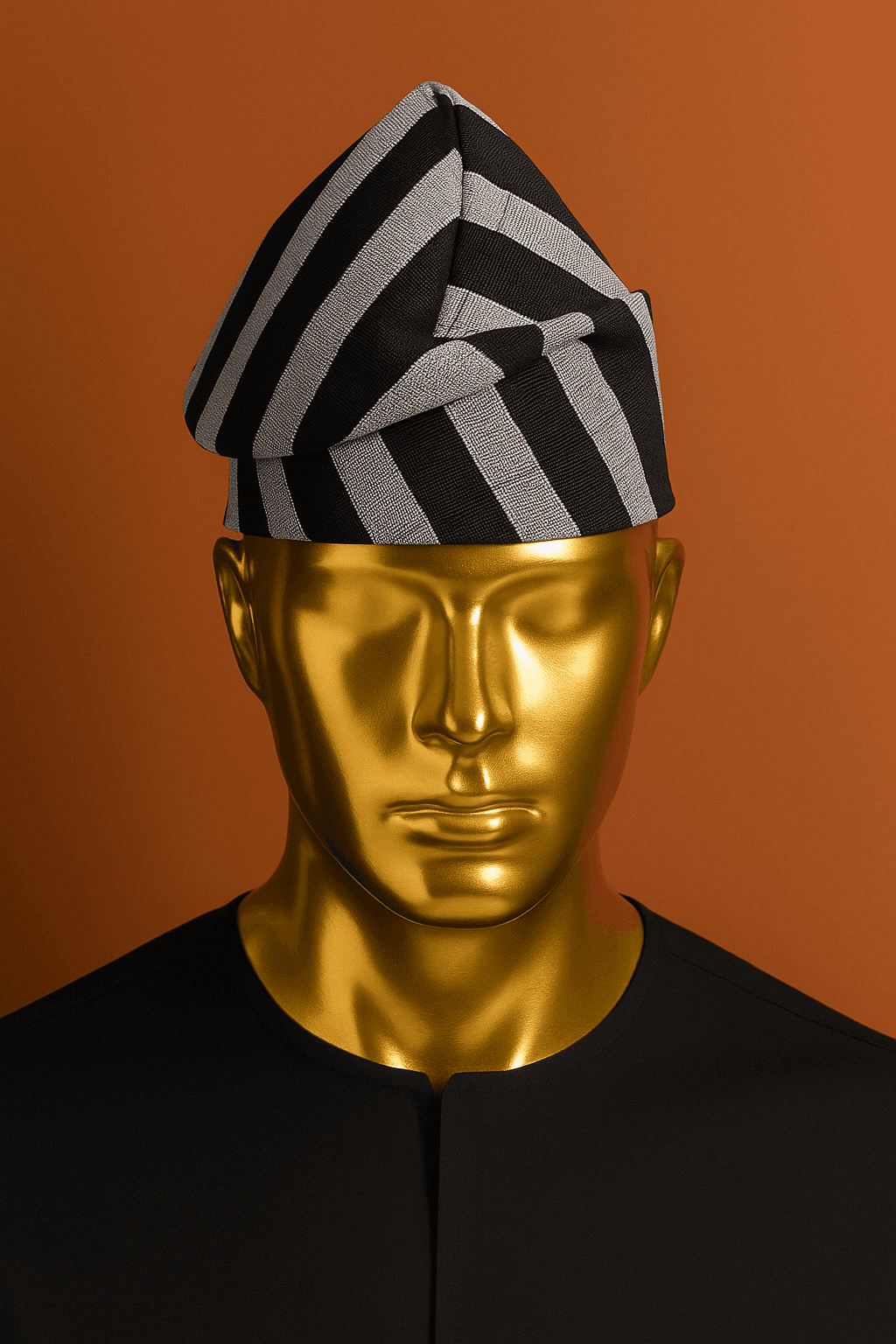 Crown your style with this distinctive black and grey striped kufi cap featuring bold geometric patterns. The contemporary chevron design creates visual interest while maintaining the traditional kufi silhouette worn across West Africa. The structured fit ensures comfortable all-day wear while the monochromatic palette offers versatile pairing with any traditional or contemporary ensemble. This is cultural headwear reimagined for the modern African gentleman. Perfect for completing Senator suits, Agbadas, or contemporary outfits where adding authentic African cultural elements matters. The striped pattern represents unity, direction, and forward movement—qualities befitting the modern African man navigating traditional and contemporary spaces. This cap works beautifully for religious observances, cultural ceremonies, and everyday wear where expressing cultural identity with style is essential.