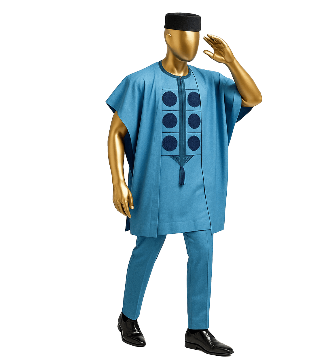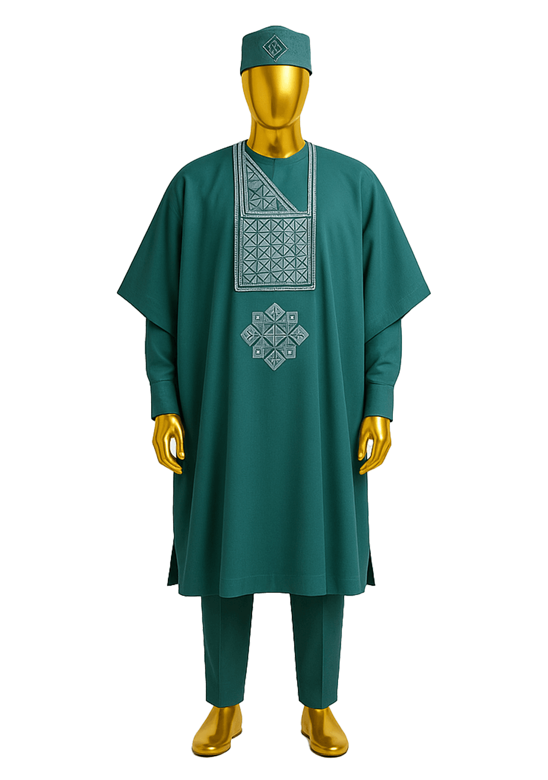 Experience the grandeur of traditional Nigerian nobility with this majestic teal Agbada featuring intricate white geometric embroidery. The flowing wide-sleeve design and matching cap create a commanding presence at any celebration. This ensemble captures the essence of owambe elegance—where culture, celebration, and style converge. Ideal for weddings, naming ceremonies, and any event where making a statement is non-negotiable.