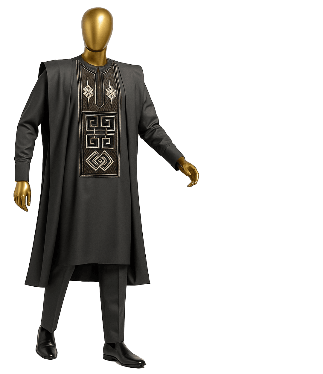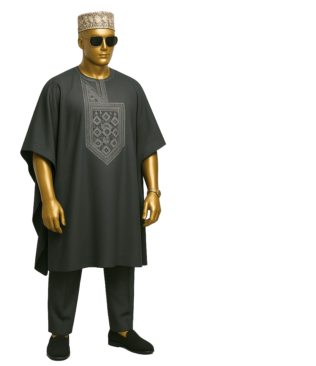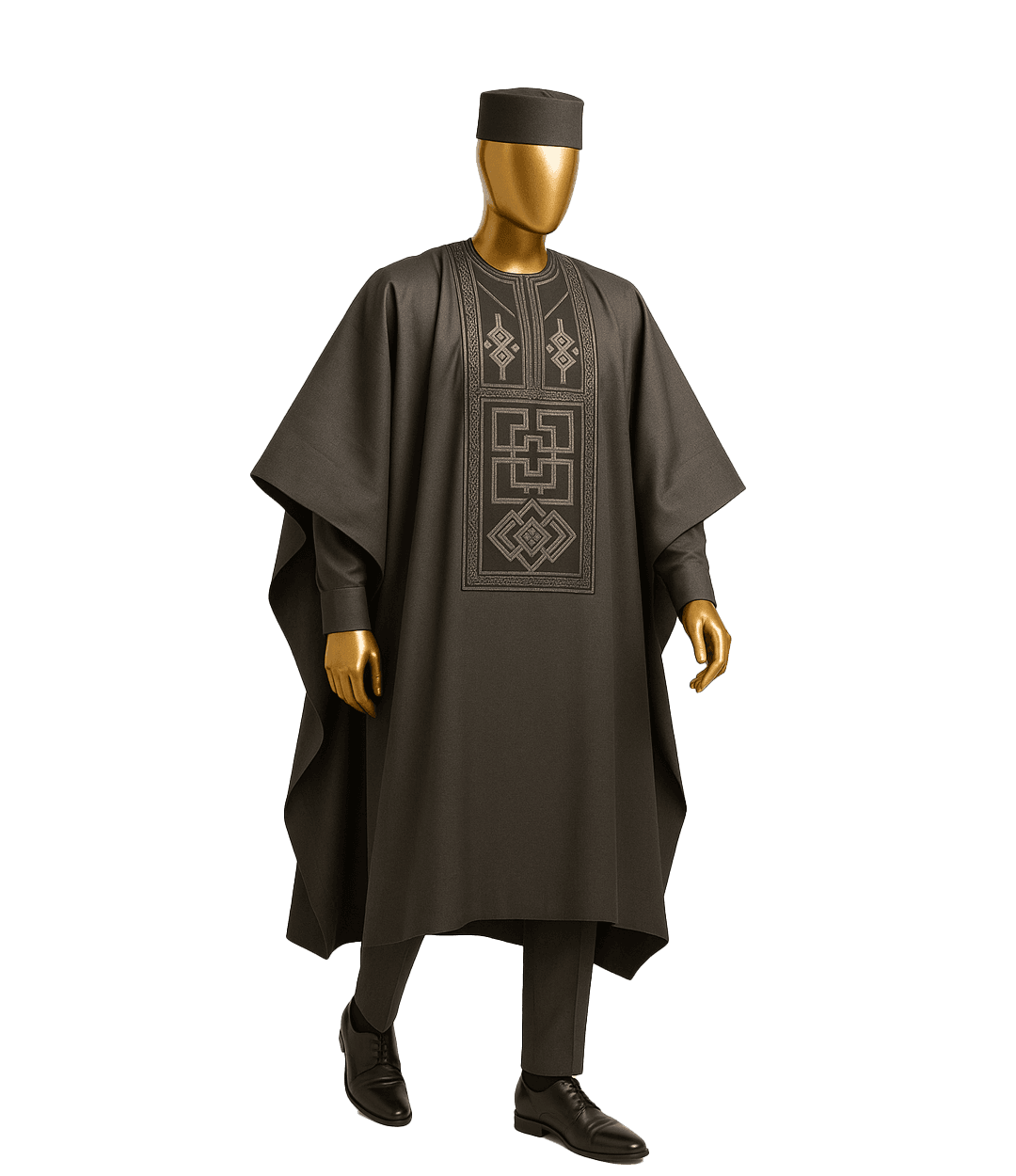 Step into understated majesty with this flowing charcoal grey Agbada featuring a stunning shield-shaped embroidered chest panel. The tonal embroidery creates subtle dimension through intricate geometric patterns inspired by ancient Nigerian symbols of protection, unity, and strength. The short-sleeved design with dramatic wide silhouette ensures you make an entrance worthy of the occasion, while the matching embroidered cap adds that essential finishing touch. This three-piece ensemble—Agbada top, tailored trousers, and cap—represents the perfect balance between bold statement and refined elegance. Ideal for the modern man who appreciates cultural authenticity without sacrificing contemporary style, this set transitions beautifully across various formal occasions. From traditional wedding ceremonies to community leadership events, religious celebrations to milestone anniversaries, this Agbada commands respect and admiration. The neutral charcoal palette offers versatility—pair with brown leather accessories for warmth or black for sleek sophistication. The breathable construction ensures comfort even during extended celebrations, while the expert craftsmanship guarantees this piece will remain a wardrobe cornerstone for years to come.