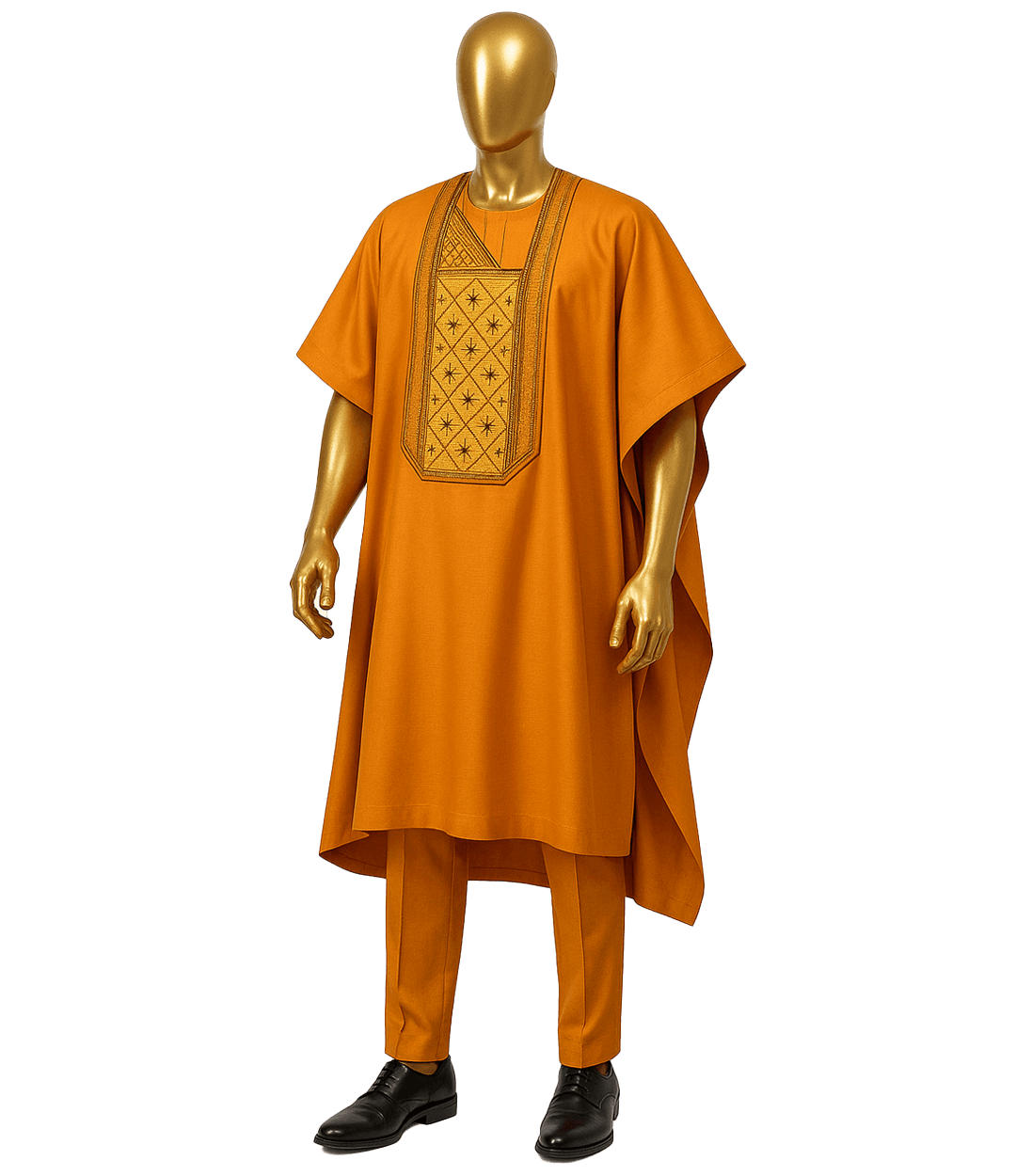 Experience timeless elegance with our Royal Amber Agbada ensemble, a masterfully crafted three-piece traditional outfit that embodies Nigerian heritage and sophistication. This stunning set features a flowing agbada (outer robe) in rich amber-gold fabric, adorned with intricate geometric embroidery on the chest panel that showcases traditional craftsmanship. The ensemble includes matching fitted trousers and an inner top, all expertly tailored for comfort and style. Perfect for weddings, cultural ceremonies, special occasions, or making a bold statement at any formal event. The vibrant amber hue symbolizes wealth and royalty, while the loose, flowing silhouette ensures comfort throughout your celebration. Each piece is custom-made to your measurements, ensuring a perfect fit that honors both tradition and contemporary style.