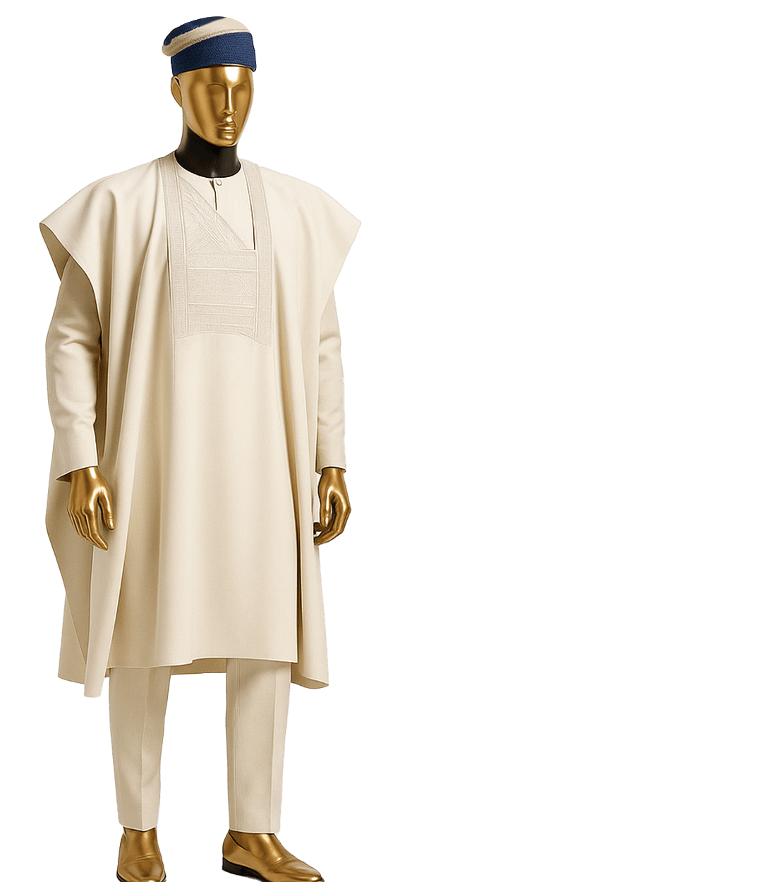 Experience majestic elegance with this luxurious cream Agbada ensemble that embodies traditional grandeur and contemporary refinement. This stunning three-piece set is designed for distinguished gentlemen who command respect and appreciate the artistry of authentic Nigerian royal attire. The outfit features a magnificent flowing Agbada in soft cream fabric with dramatic wide sleeves that create an impressive, regal silhouette. The chest area showcases subtle tonal embroidery in a geometric pattern, adding refined detail to the pristine base. The ensemble includes a matching long-sleeved inner Kaftan and coordinating straight-leg trousers, creating layers of sophistication. Completed with a distinctive two-tone Kufi cap (cream with navy trim), this complete look exudes authority and cultural pride.