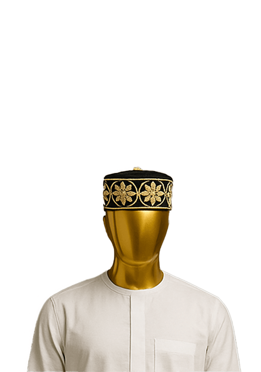 Elevate your traditional attire with our Elegant Black & Gold Embroidered Fila, a stunning cap that exemplifies refined taste and cultural sophistication. This premium traditional cap features a striking black base adorned with intricate gold embroidery in classic floral and geometric patterns that wrap around the band, creating a bold contrast that commands attention. The combination of black and gold is timeless and universally flattering, making this fila the perfect accessory for weddings, formal ceremonies, religious gatherings, or any upscale traditional event. The sophisticated color palette pairs effortlessly with virtually any outfit color—from white and cream to bold jewel tones—making it an essential and versatile addition to your traditional wardrobe. The structured design ensures it sits perfectly on the head while the detailed embroidery showcases exceptional craftsmanship.