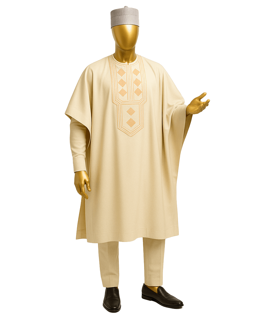 Step into timeless nobility with this flowing cream-colored Agbada featuring elegant golden embroidery cascading down the chest and lower hem. The short-sleeved outer robe drapes majestically over a long-sleeved inner tunic, creating the layered sophistication that defines traditional Northern Nigerian formal wear. The golden embroidered patterns—including ornate medallions and geometric borders—add dimension and luxury to the pristine cream canvas. This three-piece ensemble with matching cap embodies refined elegance perfect for religious celebrations, traditional weddings, and milestone gatherings. The neutral cream palette offers versatility while the golden detailing provides just enough ornamentation to elevate the look. The breathable fabric and expert construction ensure comfort during extended ceremonies. Style with coordinating cream footwear or black leather for classic contrast.