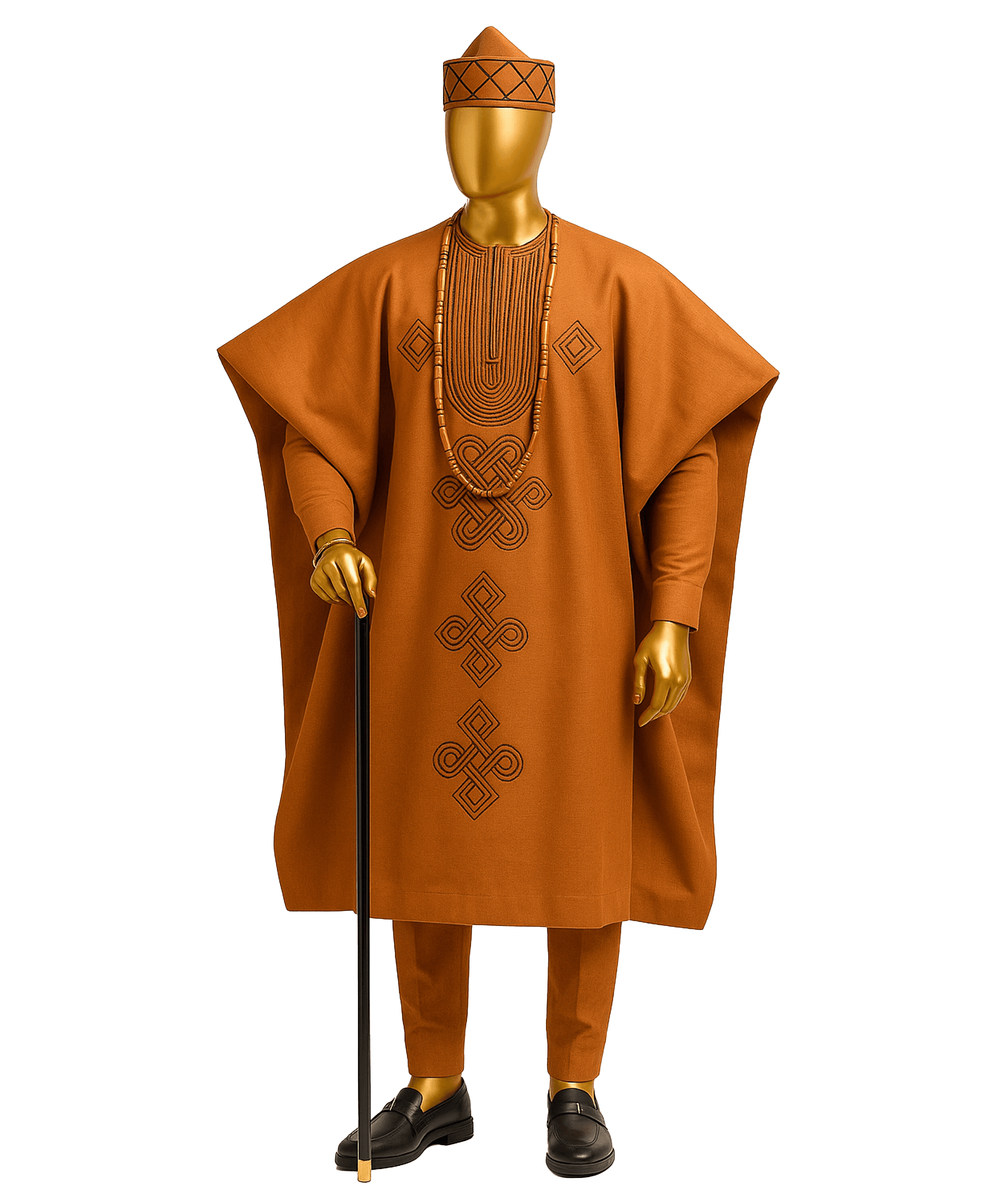 Experience regal warmth with this stunning burnt orange Agbada ensemble featuring intricate infinity knot embroidery and dramatic flowing silhouette. This magnificent four-piece set embodies traditional craftsmanship with symbolic detailing, perfect for the distinguished gentleman who appreciates rich earth tones and meaningful cultural artistry. This striking outfit showcases a short-sleeved Agbada in beautiful burnt orange fabric, adorned with elaborate tonal embroidery featuring multiple infinity knot designs running vertically down the chest. The interwoven Celtic-inspired patterns symbolize eternity, unity, and interconnectedness, while diamond motifs on the shoulders add geometric balance. The traditional wide-sleeve design creates impressive, commanding presence. The warm burnt orange hue evokes autumn richness, earthiness, and cultural warmth. Complete with matching burnt orange trousers, inner top, and a coordinating embroidered Fila cap with geometric patterns, this complete ensemble delivers powerful style for traditional weddings, chieftaincy ceremonies, cultural festivals, autumn celebrations, and prestigious gatherings. The traditional walking stick completes the distinguished, authoritative look. Custom-tailored to your exact measurements for perfect fit and comfort.