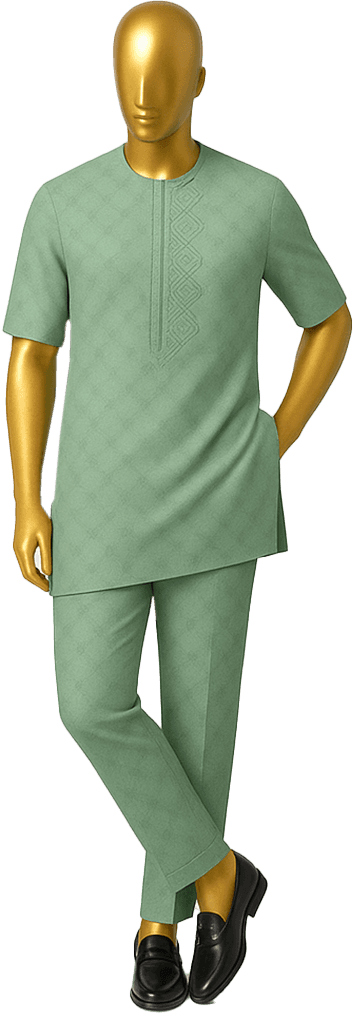 Refreshing sage/mint green short-sleeved senator with subtle geometric embroidery on chest panel. Premium solid fabric with clean silhouette and impeccable fit. The soft embroidery adds traditional touch without overwhelming the minimalist aesthetic. Complete with matching sokoto. The mint green offers cool sophistication—perfect for warm weather while maintaining traditional respect. This is understated elegance for the modern man who values simplicity. The color is memorable without being loud. Perfect for daytime celebrations, outdoor ceremonies, spring/summer weddings, garden events, beach cultural gatherings, or tropical destination traditional wear.