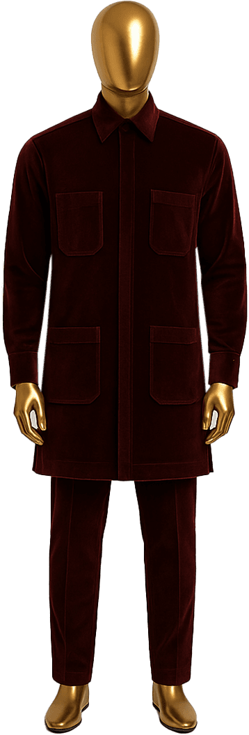 Luxurious deep burgundy velvet safari-style jacket with contemporary tailoring. The rich plush fabric features classic collar, full zipper closure, and multiple utility pockets for functional elegance. Long sleeves and structured silhouette create polished sophisticated look. Paired with coordinating burgundy trousers for complete ensemble. Crafted from premium velvet fabric with sumptuous texture and beautiful drape. The safari jacket styling brings outdoor-inspired sophistication to traditional fabrication. Deep burgundy tone exudes warmth and refined luxury. Perfect for upscale casual events, cultural gatherings, contemporary occasions, fashion-forward styling, or bridging traditional and modern aesthetics.