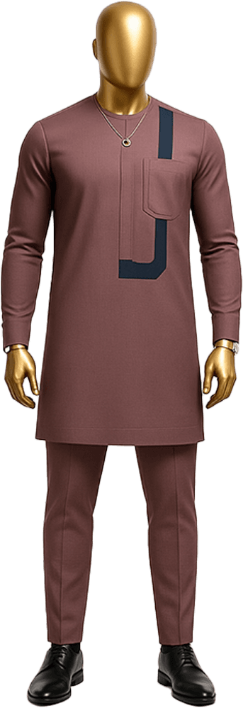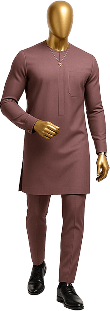 Elegant dusty rose senator suit in luxurious solid fabric with timeless appeal. Features round neckline with subtle center seam detail, functional chest pocket, and long sleeves with a tailored fit. The knee-length top flows beautifully over matching straight-cut trousers for a distinguished silhouette. The warm rosewood tone is unexpected yet refined—offering a sophisticated alternative to traditional neutrals. This outfit exudes quiet confidence and understated elegance. Perfect for weddings, naming ceremonies, family celebrations, Sunday service, or any occasion where you want to make a memorable impression without being overly bold.