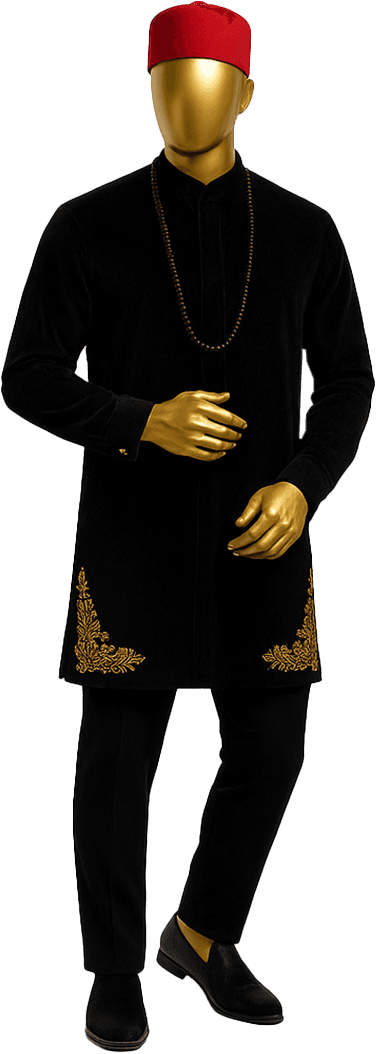 Make a sophisticated statement with this sleek all-black long-sleeved tunic featuring subtle golden corner embellishments and striking red cap. The minimalist design with delicate golden embroidery at the hem creates understated luxury, while multiple strands of burgundy beads add cultural authenticity. Complete with matching black trousers and vibrant red cap, this ensemble balances contemporary minimalism with traditional cultural elements. Ideal for the modern professional attending cultural ceremonies, creative industry events, and upscale gatherings where refined presentation meets cultural identity. The black and red combination creates powerful visual contrast while the subtle embroidery demonstrates attention to detail. This versatile set transitions beautifully across formal and semi-formal occasions.