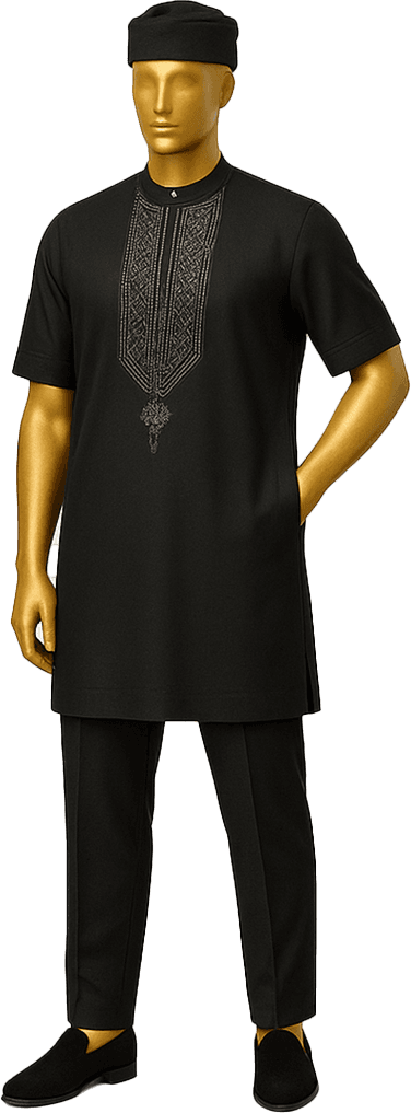 Sleek black short-sleeved senator ensemble with tonal embroidered chest panel creating subtle texture. Premium solid fabric with mandarin collar and refined tailoring. The embroidery adds dimension through texture rather than contrast. Complete with matching black cap and sokoto. Sophistication speaks in whispers, not shouts. This all-black design with tonal embroidery is for the man of quiet confidence. No bold patterns needed—the quality and fit do the talking. Perfect for evening ceremonies, upscale gatherings, business-cultural events, executive functions, or moments requiring elegant understatement.