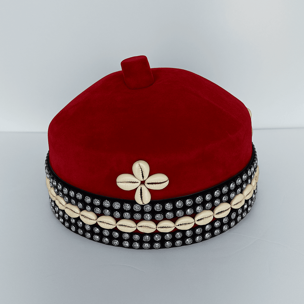 Complete your royal ensemble with this magnificent deep red velvet cap adorned with cowrie shells and black beaded bands. The structured crown features cream cowrie shells arranged in traditional cross patterns along the band—ancient symbols of wealth, prosperity, and spiritual protection across West African cultures. Multiple rows of black and silver beading add dimensional texture and visual interest. Essential for completing ceremonial attire at title-taking events, chieftaincy installations, and the most prestigious cultural gatherings. The cowrie shells carry deep historical significance as ancient African currency and spiritual talismans. This is more than headwear—it's a crown that connects the wearer to ancestral wisdom, wealth, and spiritual authority.