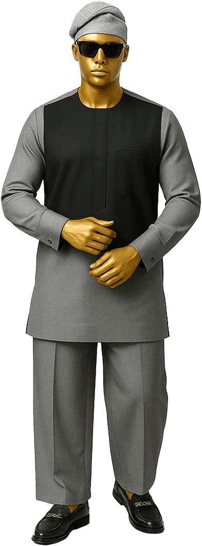 Contemporary grey and charcoal colorblock design featuring long-sleeved grey tunic with black sleeveless vest overlay. The two-tone styling creates modern dimension while maintaining traditional silhouette. Paired with matching grey trousers and cap, plus sunglasses for urban edge. This set bridges traditional and streetwear aesthetics perfectly. The colorblock vest design offers fresh visual interest while the neutral palette ensures versatility. Works beautifully for creative professionals and younger customers wanting tradition with contemporary flair.