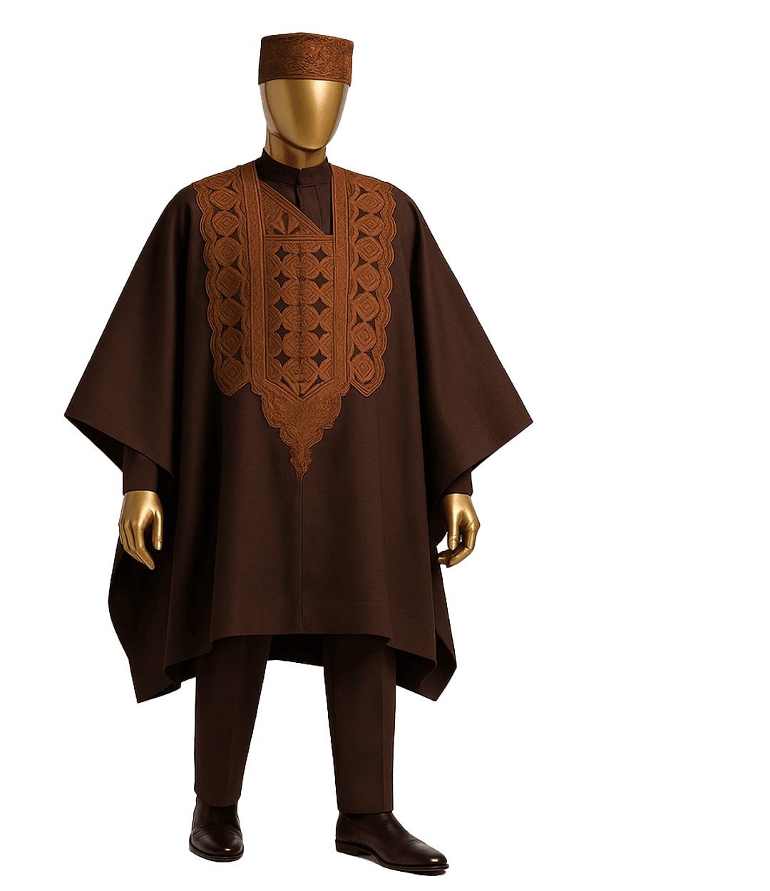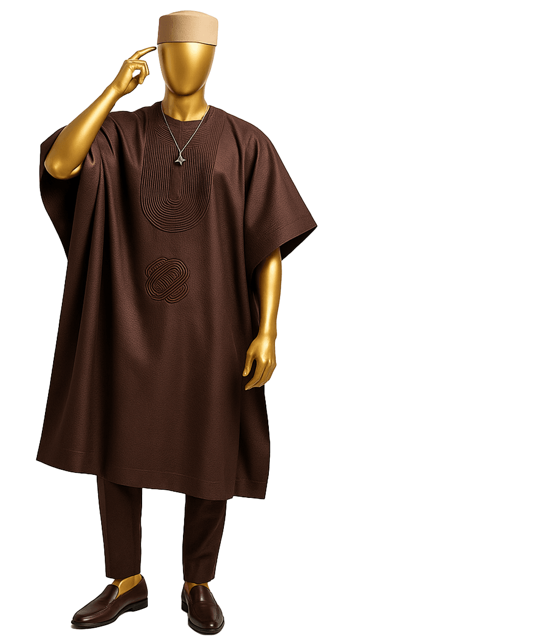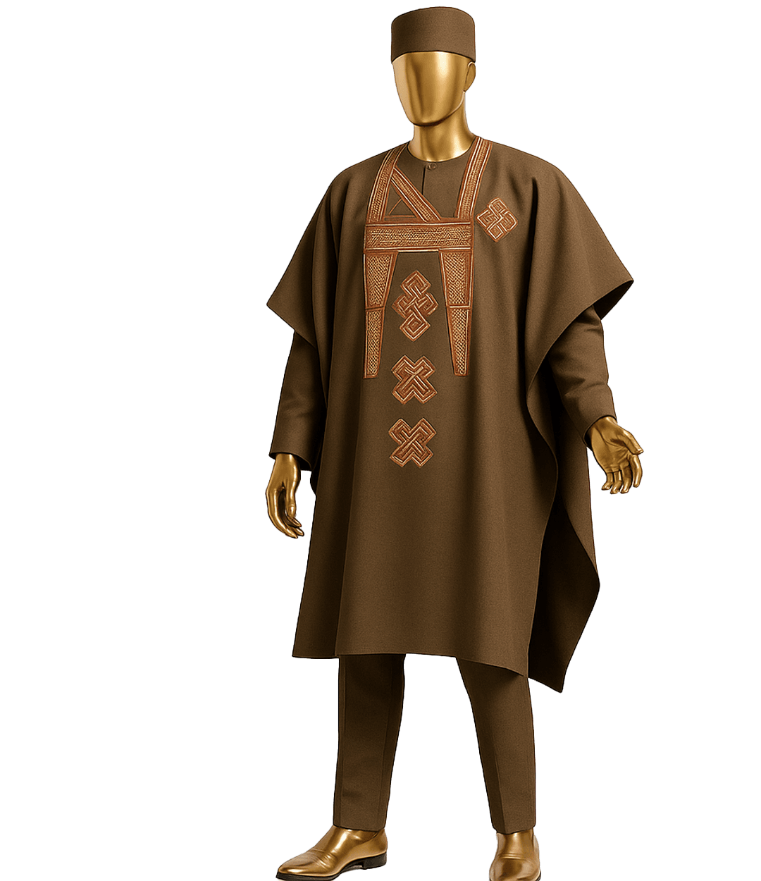Command attention with this spectacular bronze-brown Agbada featuring stunning copper embroidery that celebrates African heritage with unmatched sophistication. This luxurious three-piece ensemble is crafted for the distinguished gentleman who appreciates rich earth tones and intricate artisanship. The outfit showcases a flowing Agbada in deep chocolate-brown fabric, beautifully adorned with elaborate copper-toned embroidery in traditional geometric patterns. The chest features an impressive vertical panel with cross and diamond motifs, complemented by matching shoulder embellishments that create a balanced, regal aesthetic. The dramatic wide sleeves add gravitas and presence. Complete with matching trousers and a coordinating brown Kufi cap, this ensemble delivers powerful, sophisticated style.