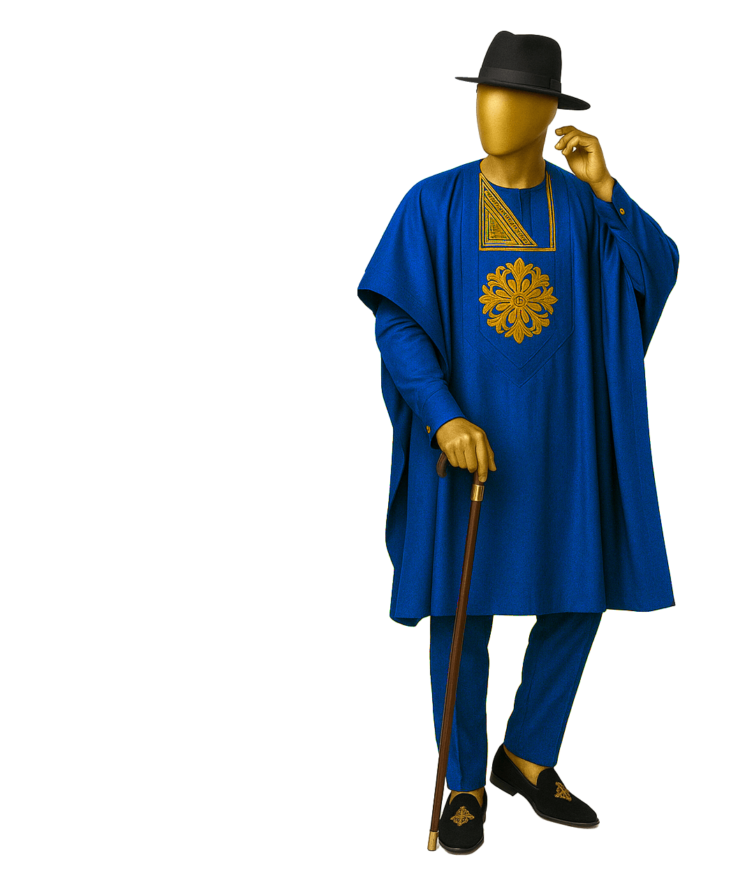 Command regal attention with this magnificent royal blue Agbada ensemble featuring stunning gold embroidered medallions and geometric accents. This luxurious four-piece set embodies bold sophistication with metallic detailing, perfect for the gentleman who embraces vibrant colors and ornate craftsmanship. This spectacular outfit showcases a short-sleeved Agbada in vibrant royal blue fabric, adorned with elaborate gold embroidered geometric designs including a large medallion motif on the chest and matching smaller medallions on the sleeves. The contrasting gold threadwork creates striking visual impact against the rich blue base. The traditional wide-sleeve design creates dramatic flow and commanding presence. Complete with matching royal blue trousers, inner top, and styled with a classic black fedora, this complete ensemble delivers powerful style for high-profile weddings, chieftaincy installations, cultural showcases, and prestigious gatherings. The royal blue symbolizes nobility, confidence, and authority. Custom-tailored to your exact measurements with traditional walking stick completing the distinguished aesthetic.