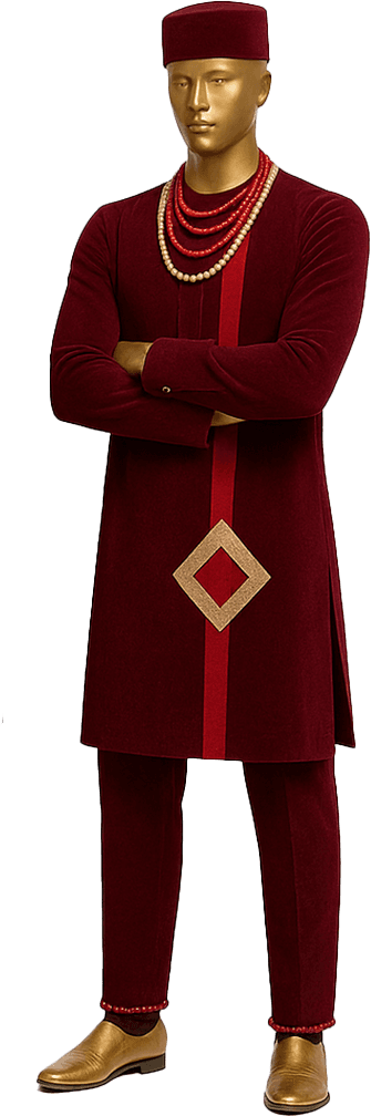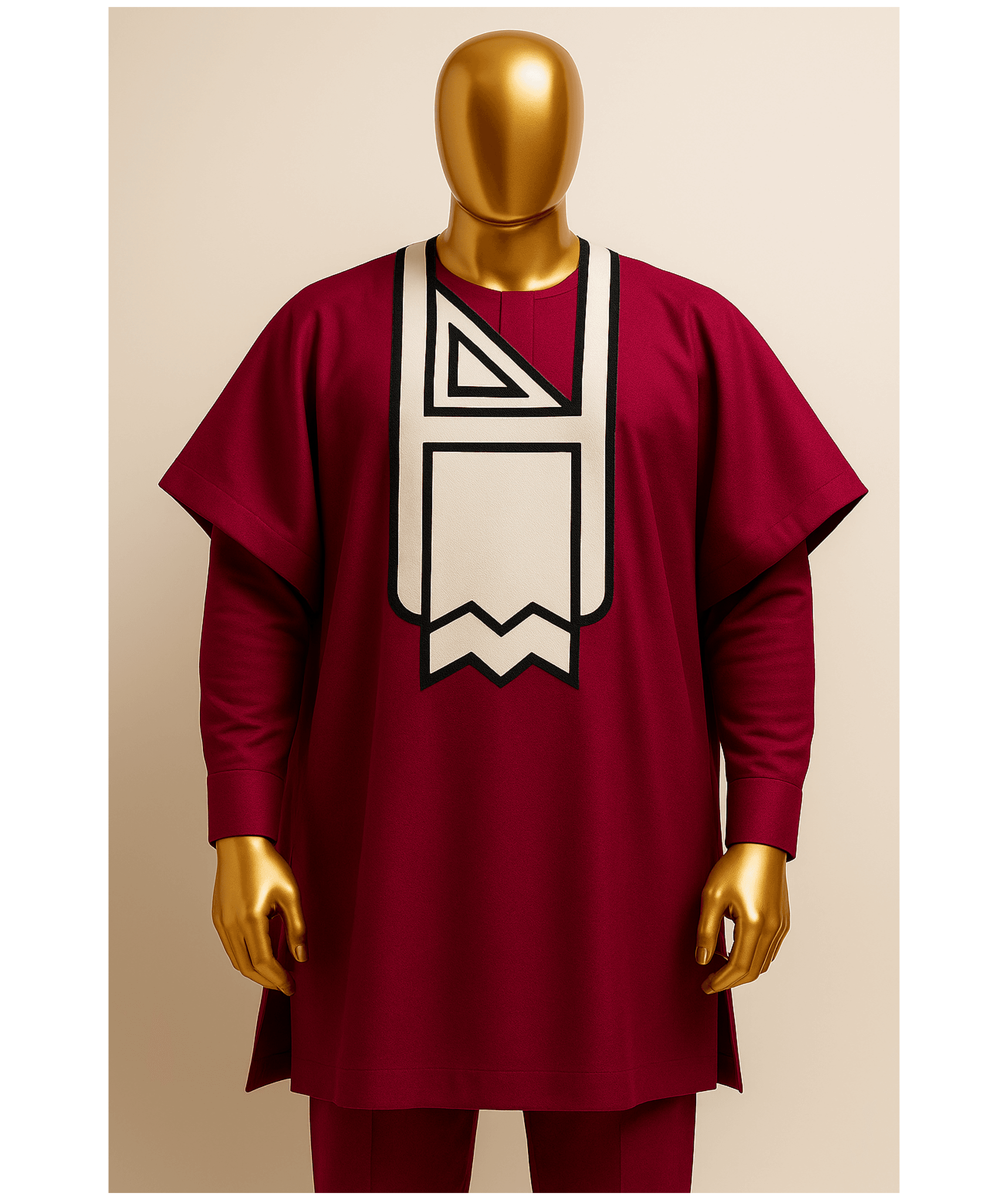 Magnificent deep burgundy long-sleeved native wear featuring bold gold and red diamond emblem on chest and asymmetric side panel. Premium solid fabric with striking geometric embroidery creating visual impact. Complete with matching embroidered fila and multi-strand coral beads. Includes coordinating sokoto. The dramatic insignia pattern symbolizes heritage, identity, and distinction. This is for men who carry themselves like royalty because they understand their cultural worth. The asymmetric design adds contemporary edge to traditional prestige. Perfect for chieftaincy events, high-profile weddings, cultural leadership occasions, prestigious ceremonies, or anytime you embody authority and tradition.