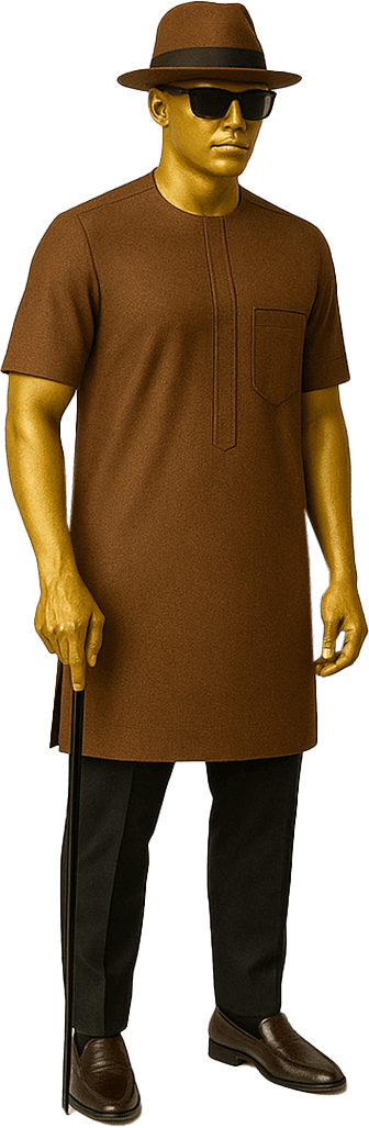 Rich camel brown short-sleeved dashiki with sleek mandarin collar and refined tailoring. Premium solid fabric offering comfortable sophistication. Paired with classic black sokoto and stylish brown fedora for complete distinguished look. The earthy tone creates warm, approachable elegance. This color bridges traditional and contemporary effortlessly—sophisticated enough for formal occasions yet relaxed enough for upscale casual wear. The fedora adds cosmopolitan flair to cultural authenticity. Ideal for daytime events, cultural brunches, outdoor ceremonies, garden weddings, destination celebrations, or the modern gentleman's everyday heritage style.