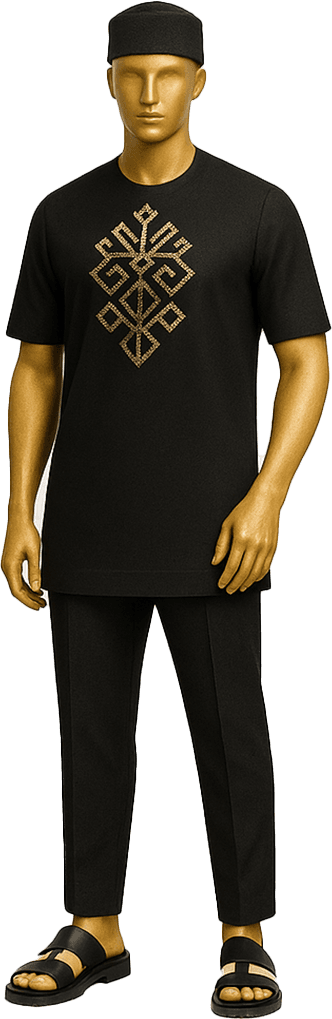 Modern black short-sleeved dashiki with striking golden geometric embroidery on the chest. Premium cotton-blend fabric offers comfortable everyday wear with cultural flair. The minimalist design features clean lines and subtle ornamentation. Includes matching black cap and sokoto for a complete casual-traditional look. This bridges the gap between streetwear and tradition—perfect for the modern African man. The understated golden embroidery adds cultural identity without being formal. Comfortable enough for daily wear yet respectful enough for casual traditional occasions. Ideal for weekend gatherings, casual family events, community functions, cultural meet-ups, or everyday heritage wear.