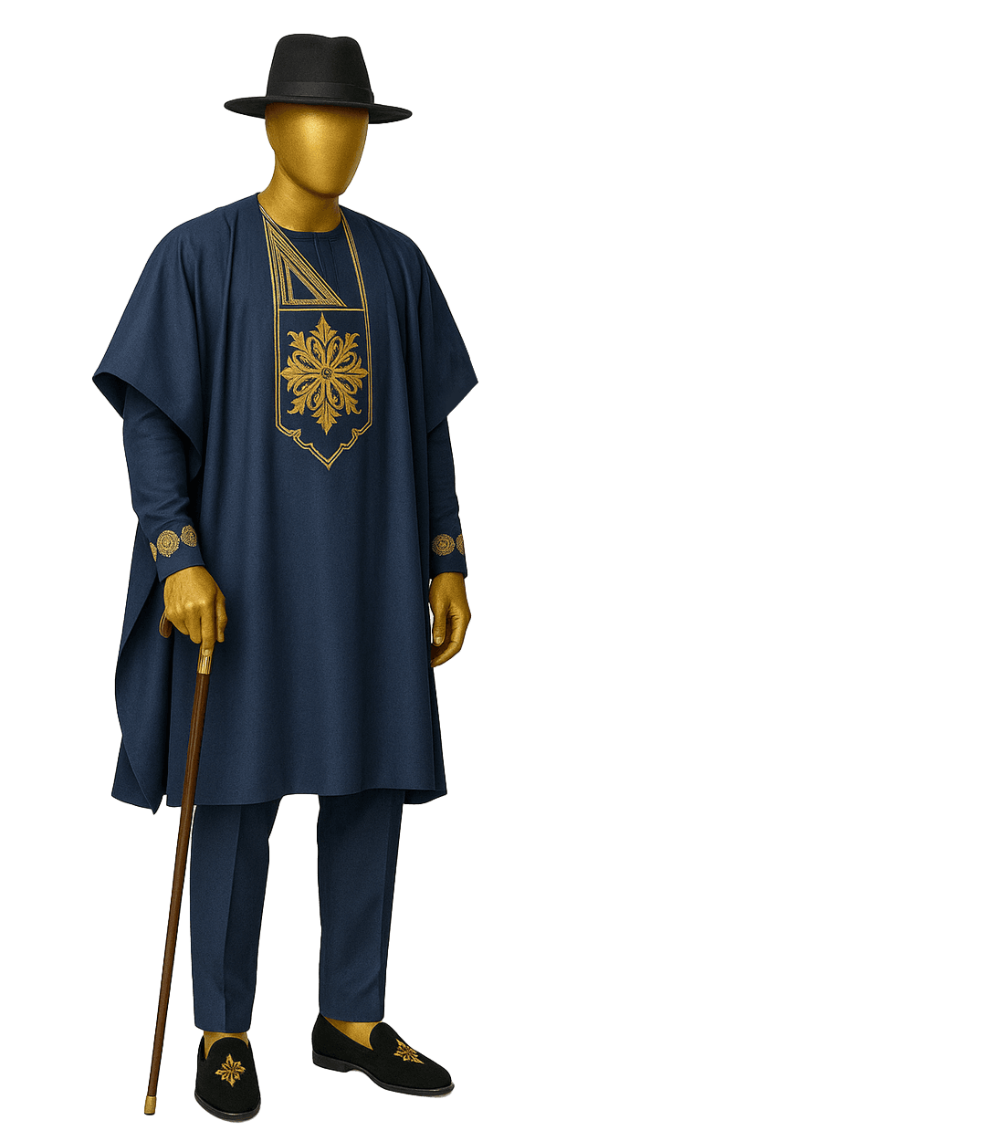 Embrace sophisticated elegance with this stunning navy blue Agbada ensemble featuring intricate gold embroidered star and geometric motifs. This refined four-piece set combines deep navy richness with luxurious gold accents, perfect for the gentleman who appreciates classic combinations and detailed artistry. This impressive outfit showcases a short-sleeved Agbada in deep navy blue fabric, beautifully adorned with gold embroidered designs featuring an ornate eight-pointed star medallion on the chest and geometric triangle accents at the neckline. Matching gold embroidered circular motifs on the sleeves create balanced, cohesive detailing. The traditional wide-sleeve design creates regal presence and flow. Complete with matching navy trousers, inner top, and styled with a classic black fedora, this complete ensemble delivers timeless sophistication for evening weddings, formal ceremonies, upscale cultural events, and occasions requiring distinguished elegance. The navy and gold combination conveys authority, prosperity, and refined taste. Custom-tailored to your exact measurements with traditional walking stick and gold-embroidered shoes completing the luxurious look.