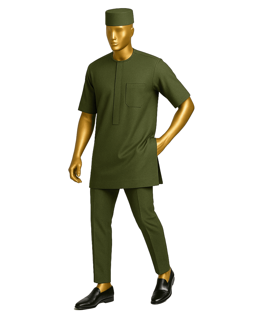 Make a distinguished statement with this luxurious olive green Senator ensemble that perfectly balances earthy sophistication with modern style. This rich, nature-inspired color exudes confidence and refined taste, making it an essential addition to any discerning gentleman's wardrobe. The outfit features a short-sleeved Senator top in a deep olive tone, designed with a round neckline, practical chest pocket, and clean front placket detail. The relaxed yet structured fit ensures all-day comfort while maintaining a sharp, polished appearance. Paired with matching tapered trousers and a coordinating traditional cap (Kufi), this complete ensemble delivers effortless style from head to toe.
