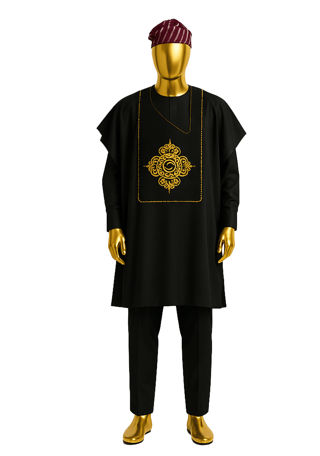 Experience refined elegance with this sophisticated all-black Agbada ensemble featuring a striking gold embroidered medallion centerpiece. This three-piece set combines minimalist sophistication with luxurious detailing, perfect for the discerning gentleman who appreciates understated opulence and timeless style. The outfit showcases a short-sleeved Agbada in premium black fabric with a magnificent gold embroidered medallion design on the chest, framed by elegant golden piping that creates a rectangular panel. The intricate circular motif features traditional geometric patterns that catch light beautifully. The wide-sleeve design maintains traditional flow while the contemporary cut offers modern comfort. Complete with matching black trousers and a distinctive burgundy striped Kufi cap, this ensemble delivers sophisticated contrast and cultural elegance.