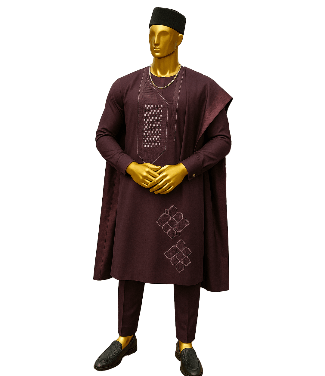 Experience regal sophistication with this stunning plum burgundy Agbada featuring cream lattice and floral embroidery. This luxurious four-piece set combines rich wine tones with ornate geometric detailing, perfect for the gentleman who appreciates depth of color and intricate patterns. This magnificent outfit showcases a short-sleeved Agbada in deep plum burgundy fabric, adorned with beautiful cream-colored embroidery featuring lattice patterns on the chest pocket and geometric diamond motifs arranged vertically. The contrast embroidery creates striking visual impact. The traditional wide-sleeve design creates commanding presence. Complete with matching plum trousers, inner long-sleeved top, and a coordinating black Kufi cap, this complete ensemble delivers powerful elegance for evening weddings, formal ceremonies, autumn celebrations, and prestigious cultural gatherings. The plum symbolizes nobility, richness, and refined taste. Custom-tailored to your exact measurements.