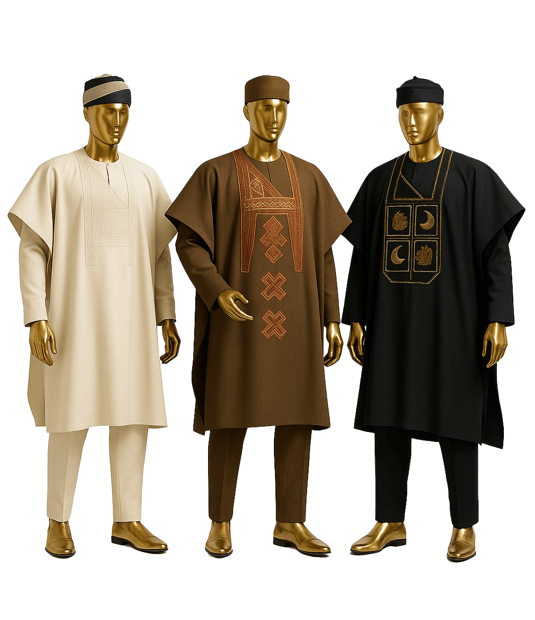 Discover timeless versatility with this stunning collection of three embroidered Agbada ensembles in cream, brown, and black. This premium trio showcases the essential colors every distinguished gentleman needs in his traditional wardrobe, each featuring unique embroidery designs that celebrate cultural artistry and sophisticated style. Each short-sleeved Agbada features traditional wide sleeves for impressive flow, comes as a complete three-piece set with matching trousers and coordinating Kufi cap, and is custom-tailored to your exact measurements. Available individually or as a complete collection for the gentleman who demands options for every occasion.