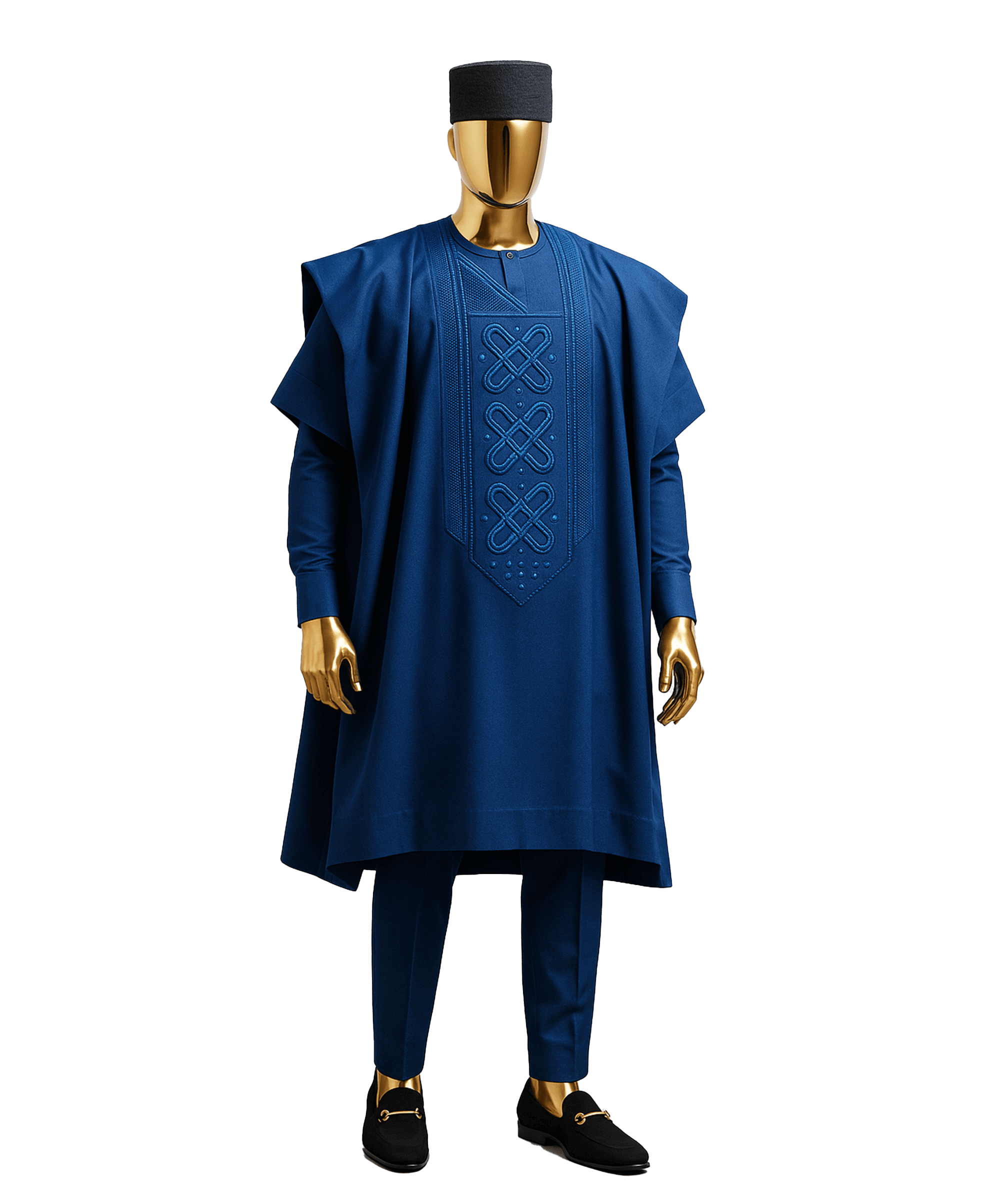 Make an unforgettable impression in this majestic royal blue Agbada featuring sophisticated tonal embroidery across the chest panel. The short-sleeved flowing design showcases intricate geometric Celtic-inspired knotwork patterns that create striking visual texture against the rich sapphire fabric. The wide silhouette commands attention and respect, while the matching cap and tailored trousers complete this three-piece ensemble with regal cohesion. The deep blue hue represents wisdom, stability, and royal heritage—qualities embodied by leaders and distinguished gentlemen across generations. This ensemble bridges the gap between traditional Nigerian formal wear and contemporary luxury aesthetics. The flowing Agbada design offers comfort and dramatic presence at weddings, chieftaincy installations, cultural festivals, and upscale celebrations. The expert embroidery work demonstrates masterful craftsmanship, with each stitch contributing to the overall narrative of excellence and cultural pride. Style with black leather loafers for timeless sophistication or brown for warmer tones. The premium fabric drapes beautifully while maintaining structure, ensuring you look distinguished from every angle throughout your event.